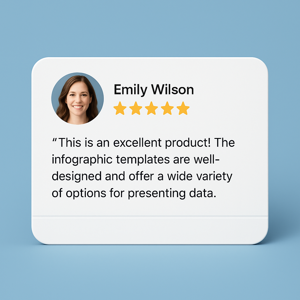 /Collection: /by davooda/Type: PNG/A testimonial block featuring a circular photo of Emily Wilson, along with her five-star rating and a positive review about infographic templates. The background is a smooth gradient.
