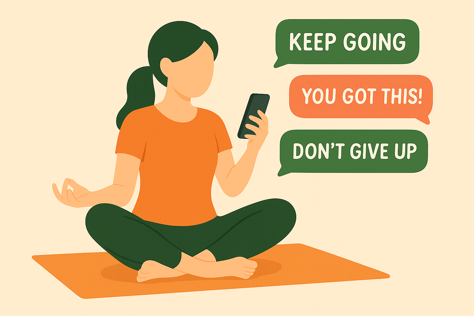 /Collection: /by davooda/Type: PNG/A calming illustration depicting a person meditating while holding a phone, surrounded by encouraging messages. Ideal for wellness and mental health content.