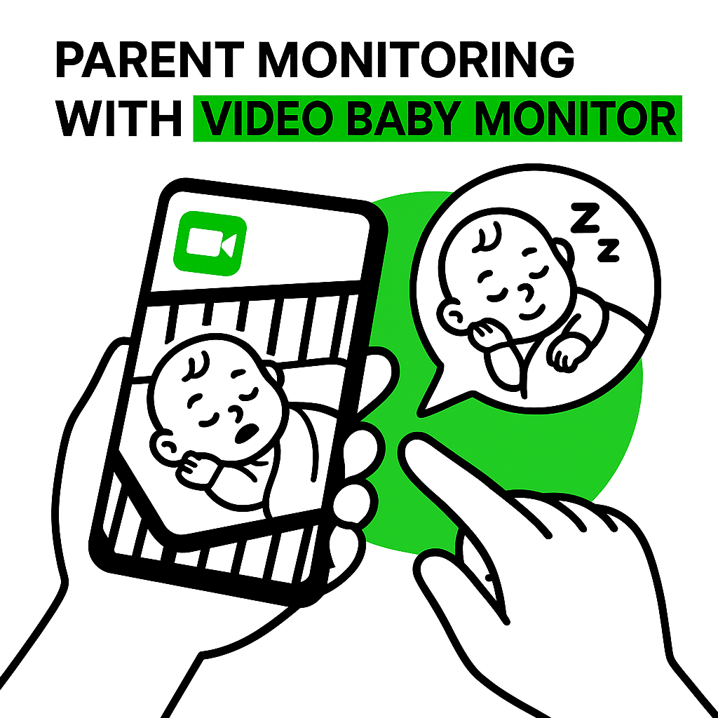 /Collection: /by davooda/Type: PNG/A graphic illustrating the concept of parent monitoring using a video baby monitor. The design features simple line art and vibrant colors, making it ideal for parenting-related content.