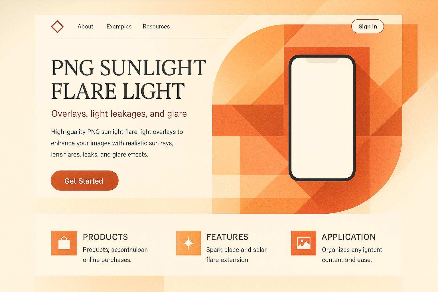 A visually appealing landing page layout featuring a smartphone mockup, geometric design elements, and sunlight flare effects. The layout includes a menu, action buttons, and product sections.