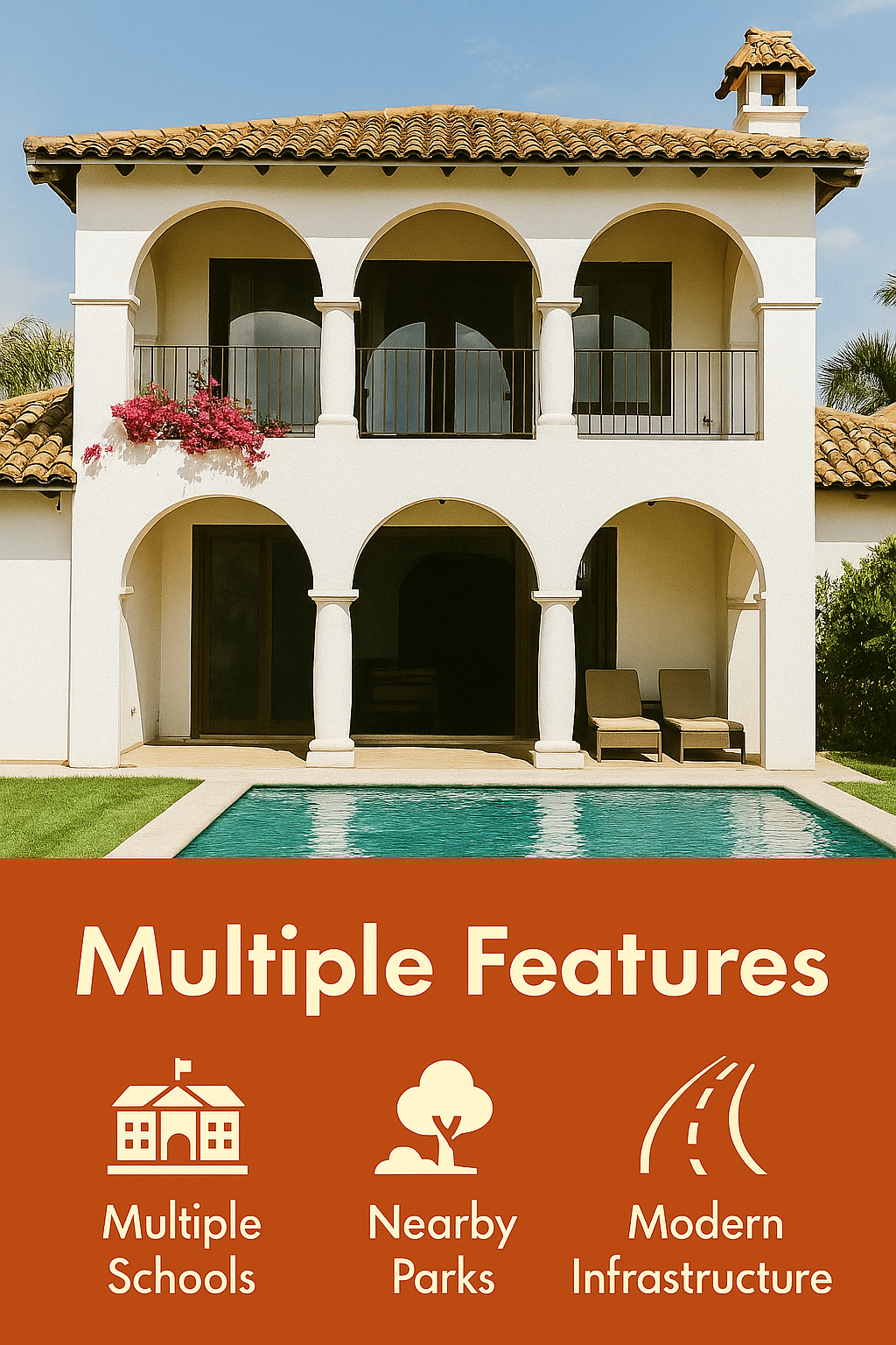 Promotional real estate image showcasing a beautiful home with a pool, emphasizing nearby amenities and modern infrastructure. Ideal for marketing properties.