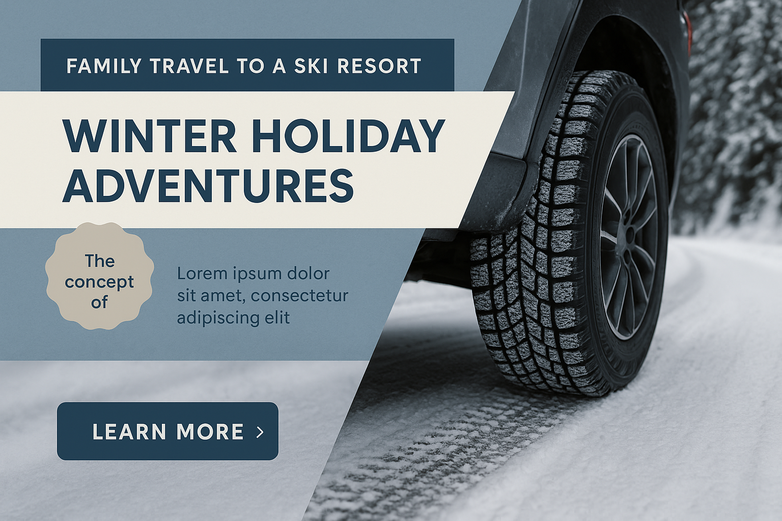 A close-up view of an SUV tire on a snowy highway, emphasizing winter travel. The scene illustrates family adventures to ski resorts, with space for additional text.