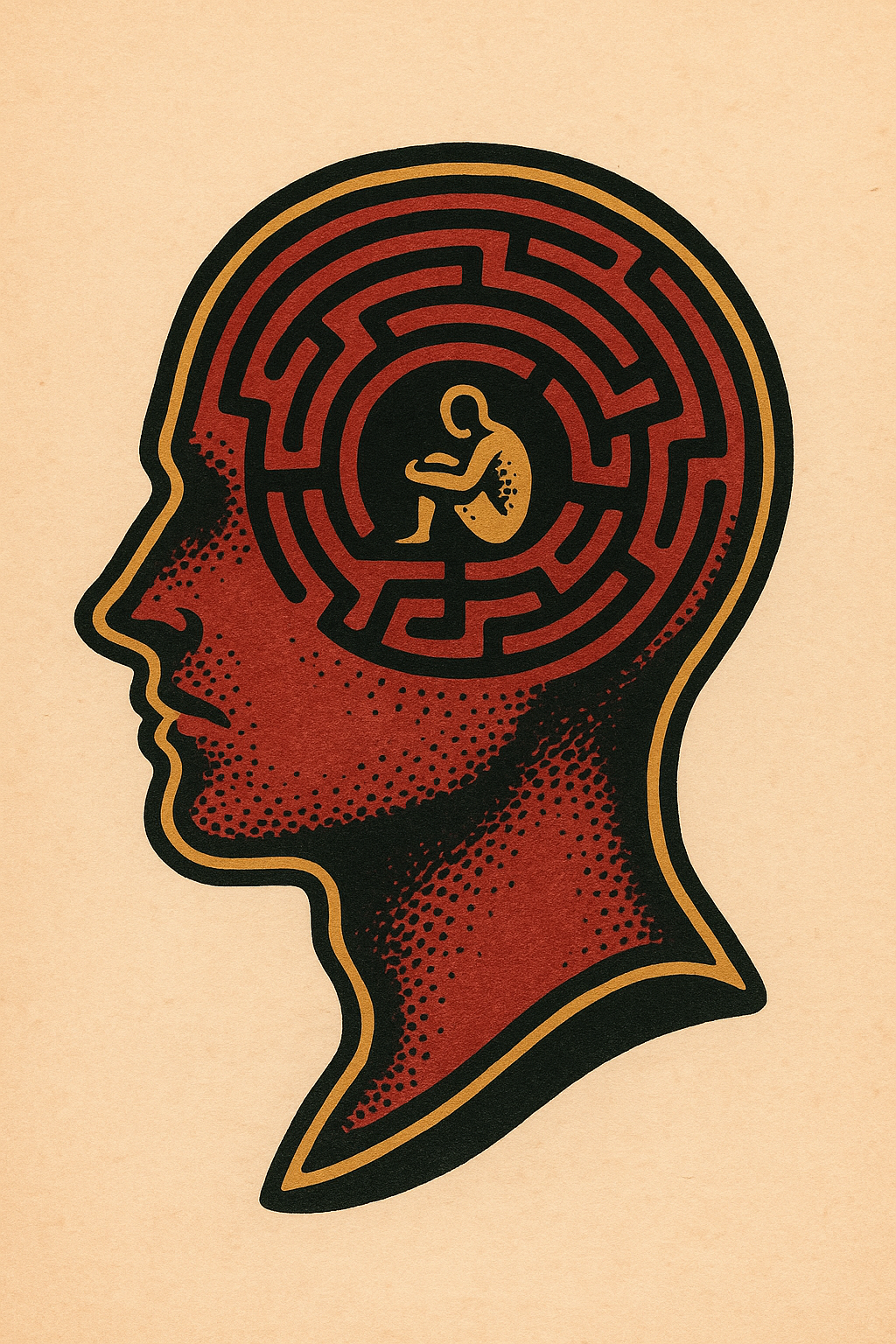 /Collection: /by davooda/Type: PNG/A creative tattoo design featuring a silhouette of a head shaped like a maze, with a small figure seated inside. The artwork showcases vibrant colors on a light beige background.