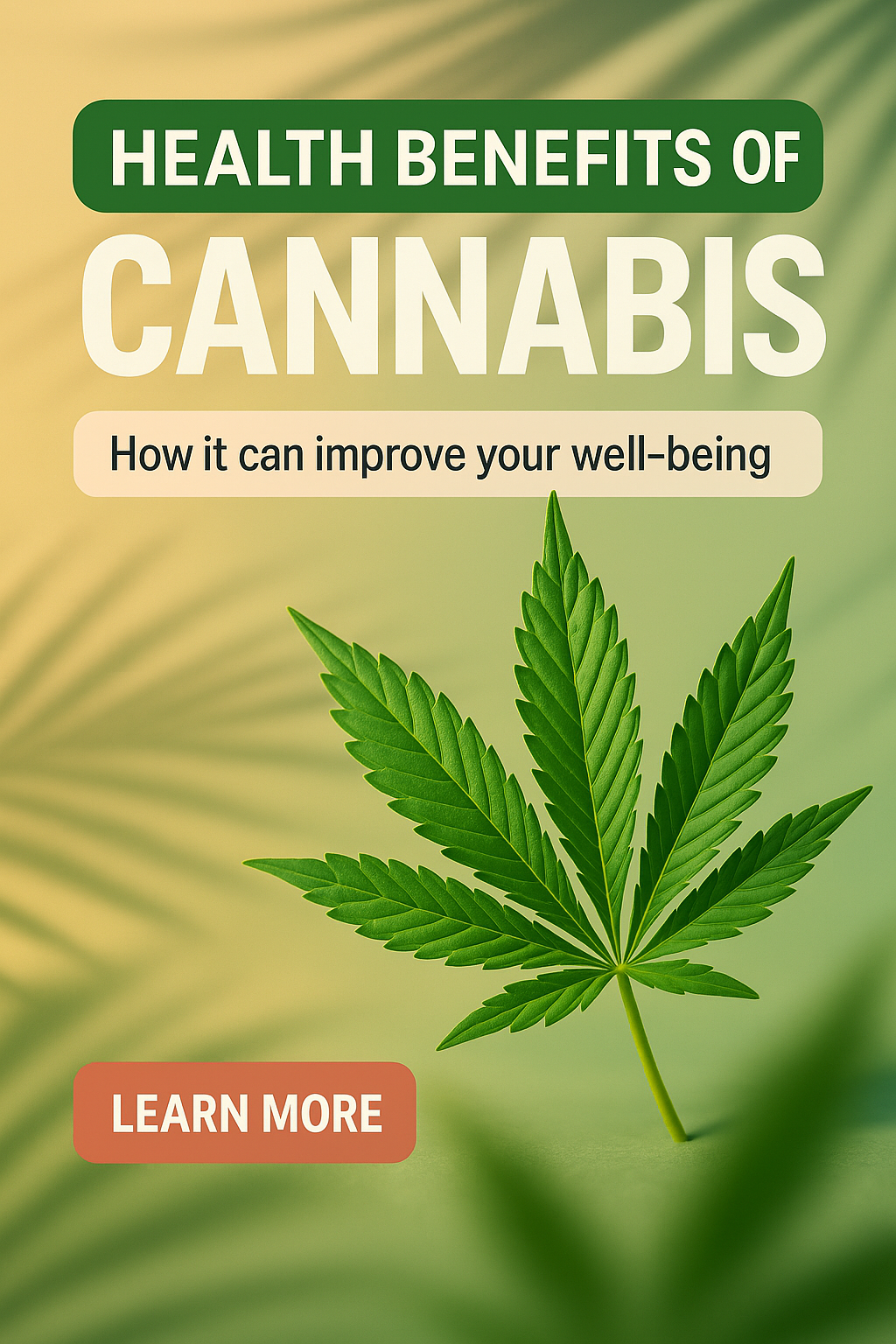 /Collection: /by davooda/Type: PNG/A visually appealing graphic highlighting the health benefits of cannabis, featuring a cannabis leaf and a modern design, suitable for educational purposes and health awareness campaigns.