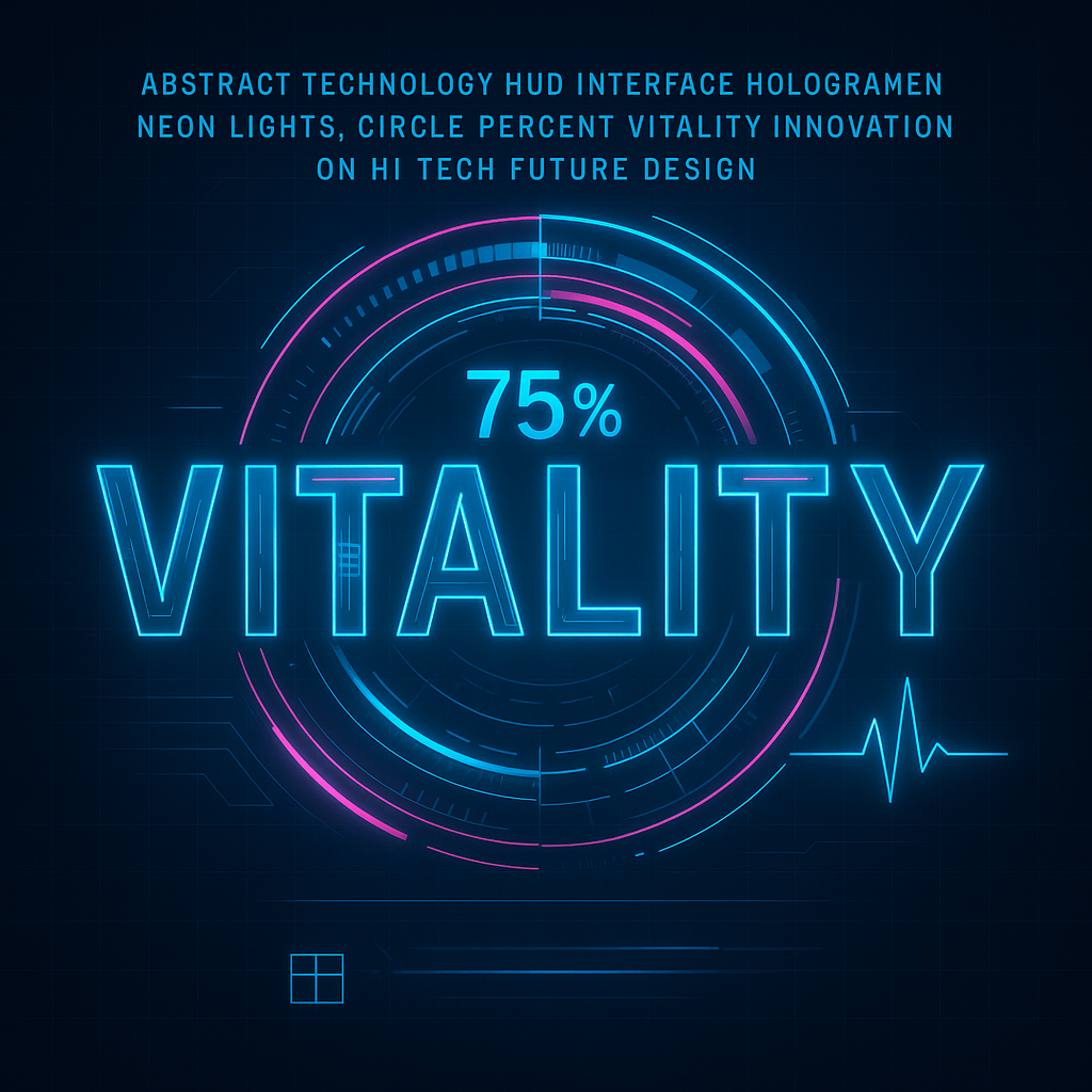 A high-tech interface graphic showcasing a vitality percentage in a neon style, ideal for health tech or fitness applications. The design features glowing elements against a dark background.