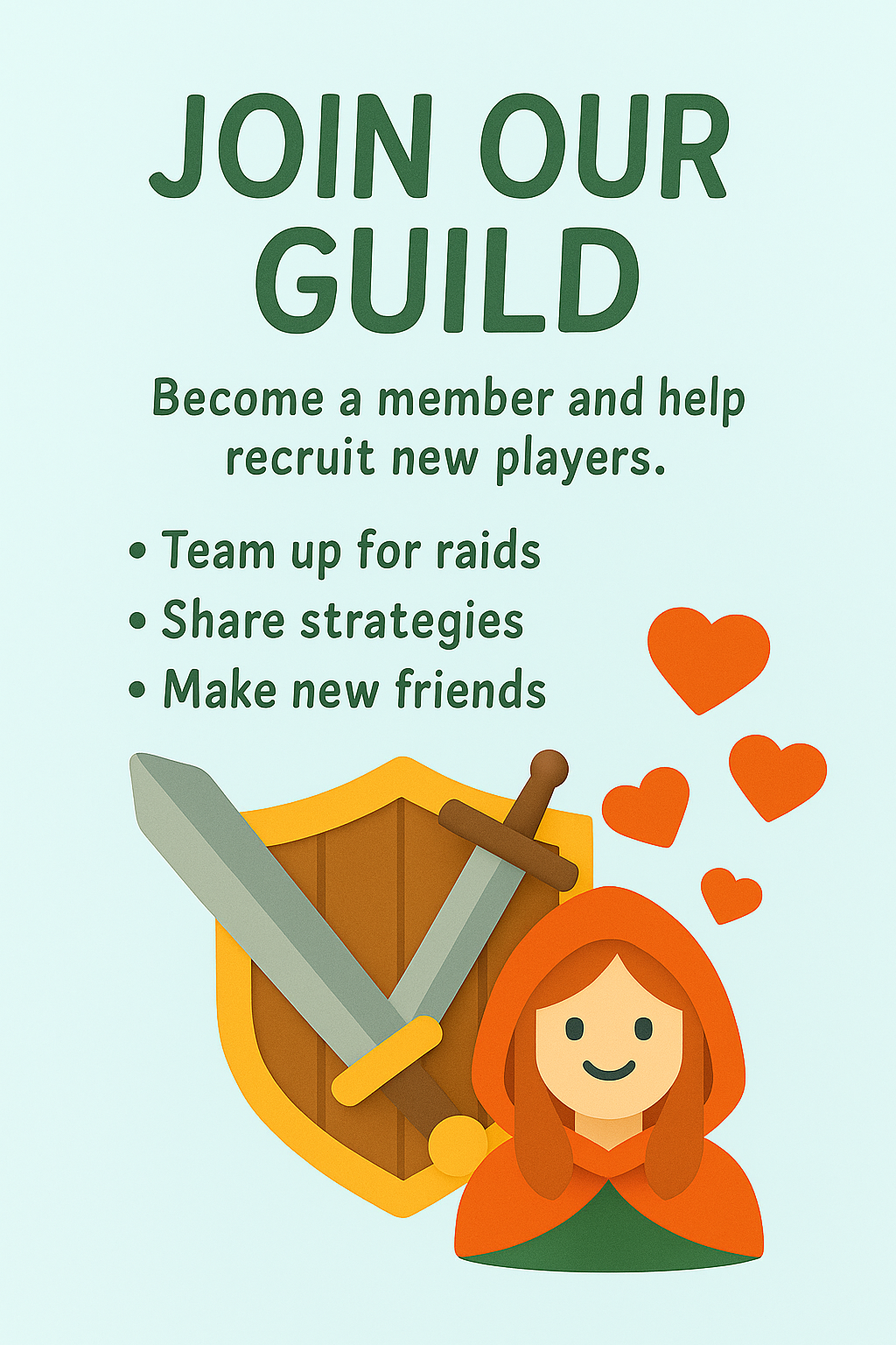 Colorful and engaging graphic promoting a gaming guild, featuring playful illustrations and inviting text. Ideal for social media or community boards.