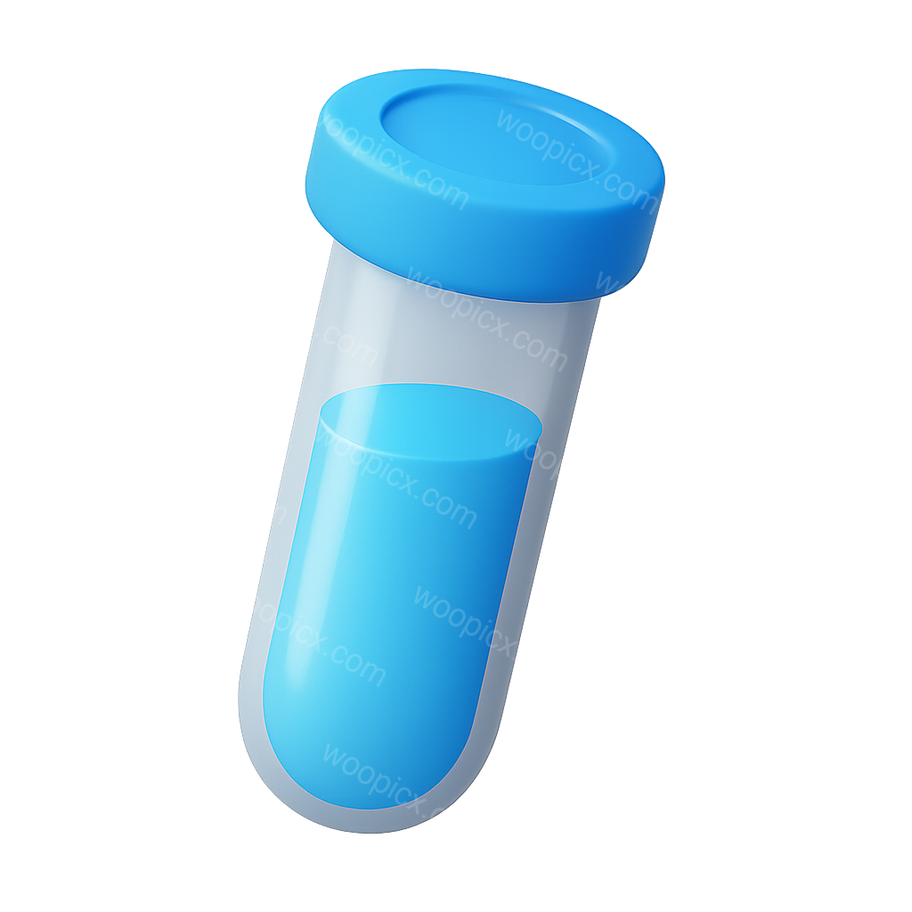 A 3D icon of a test tube featuring a blue cap and liquid. The design showcases a three-quarter view with a transparent background, emphasizing its volumetric shape.