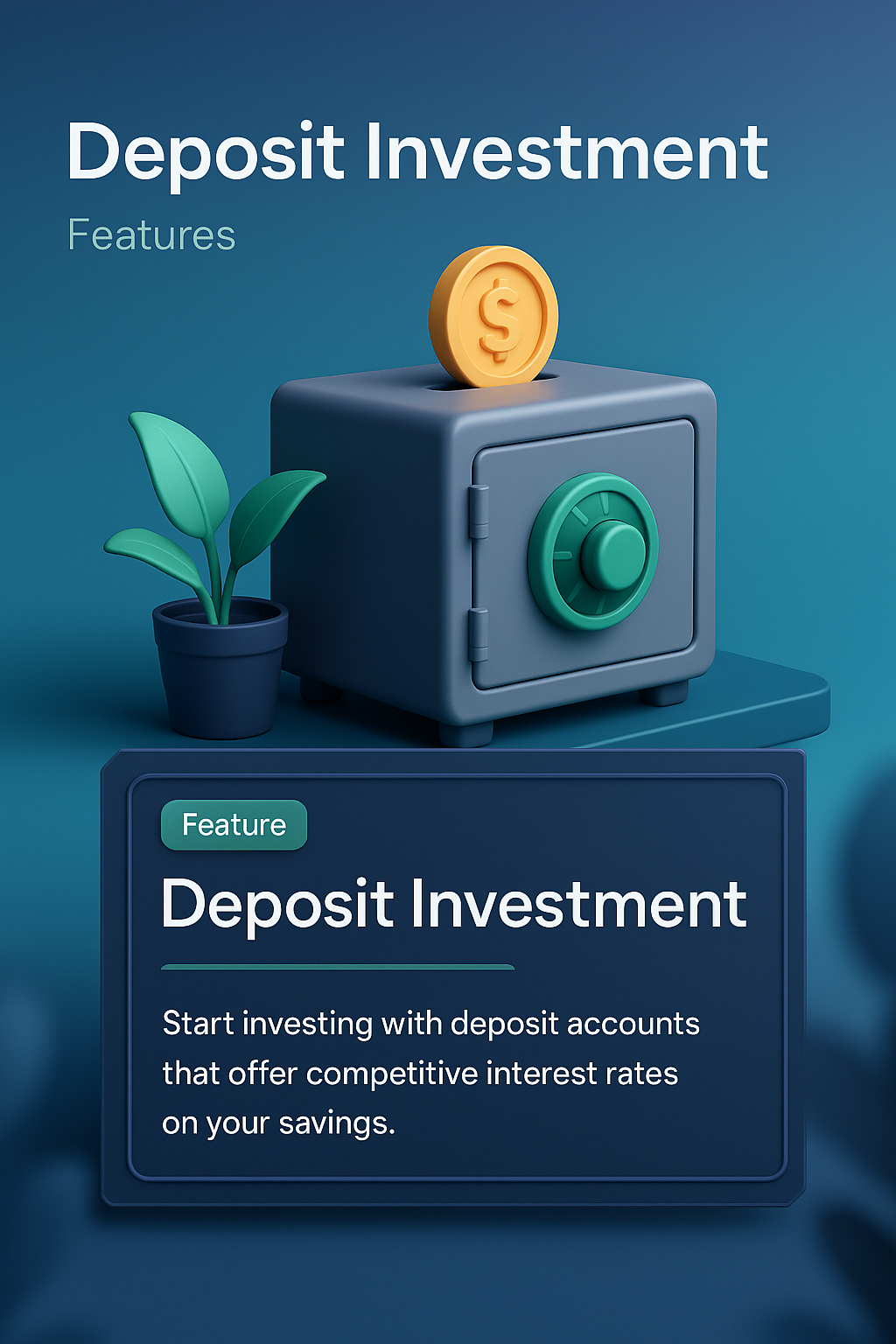 A 3D illustration showcasing a deposit investment theme, featuring a safe with a coin, a plant, and a text block highlighting investment features.