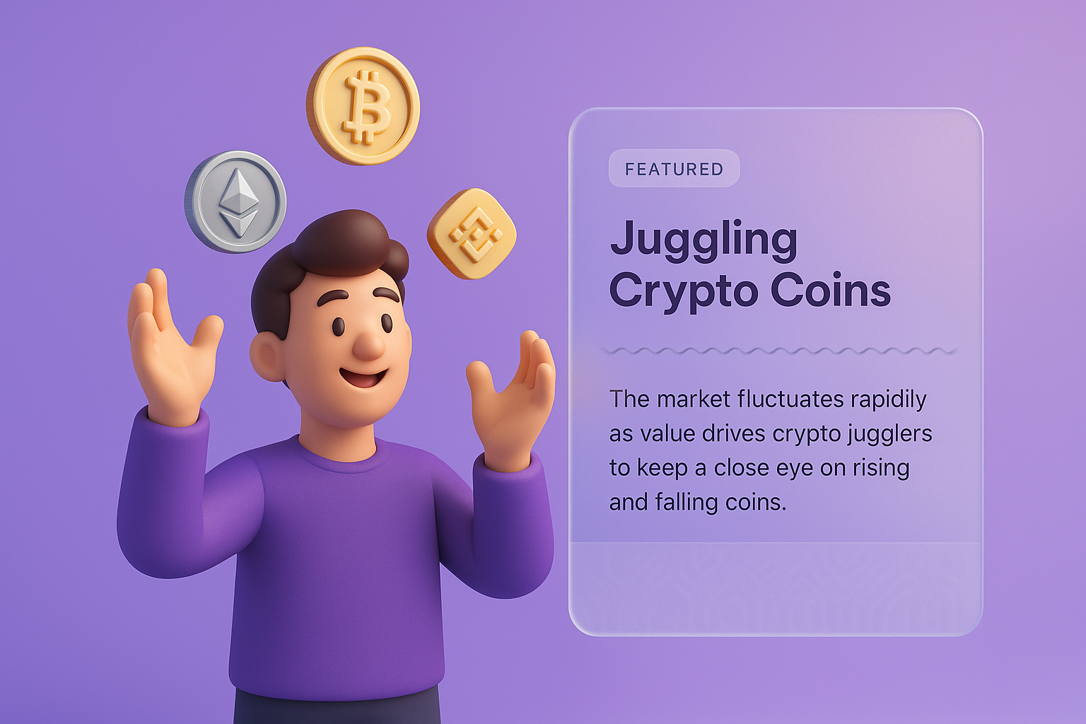 A 3D character is juggling various crypto coins like Bitcoin and Ethereum. The background features a smooth gradient, enhancing the vibrant theme of cryptocurrency. A side panel provides additional information.