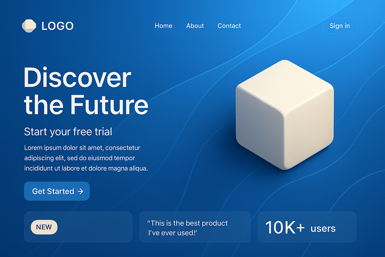 /Collection: /by davooda/Type: PNG/A professional landing page layout featuring a blue gradient background and geometric elements. Includes bold typography, a call-to-action button, and user stats.