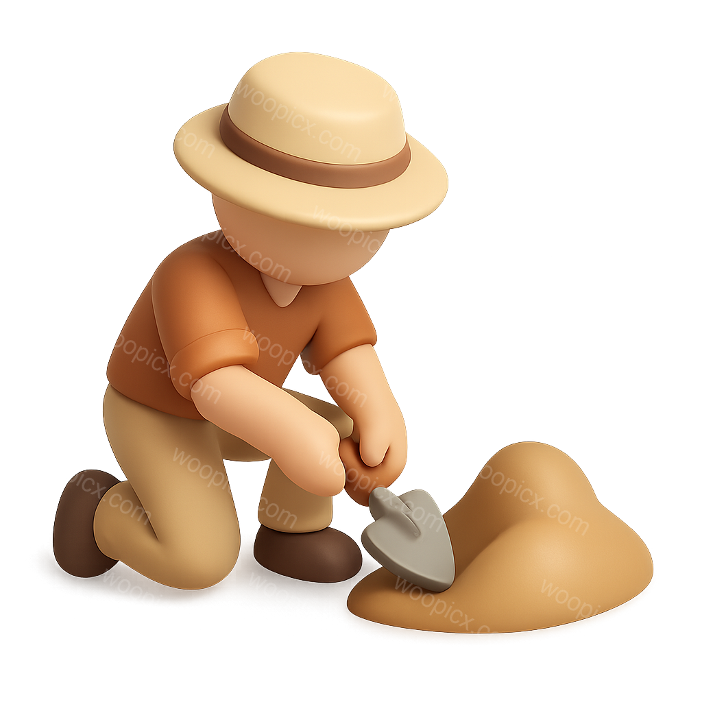 A 3D stylized icon depicts an archaeologist in a three-quarter view, wearing a hat and digging in the sand with a trowel. The background is transparent, emphasizing the character's volumetric design.