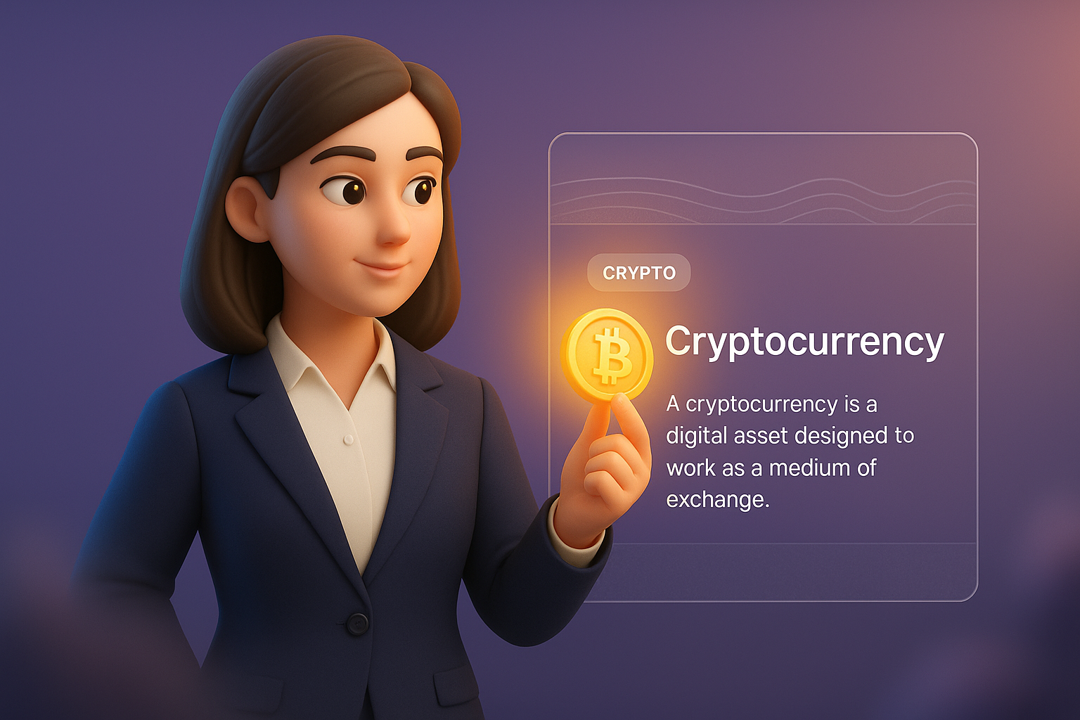/Collection: /by davooda/Type: PNG/A 3D illustration of a businesswoman holding a glowing cryptocurrency coin, set against a smooth gradient background. The image features text blocks describing cryptocurrency as a digital asset, integrated with stylish design elements.