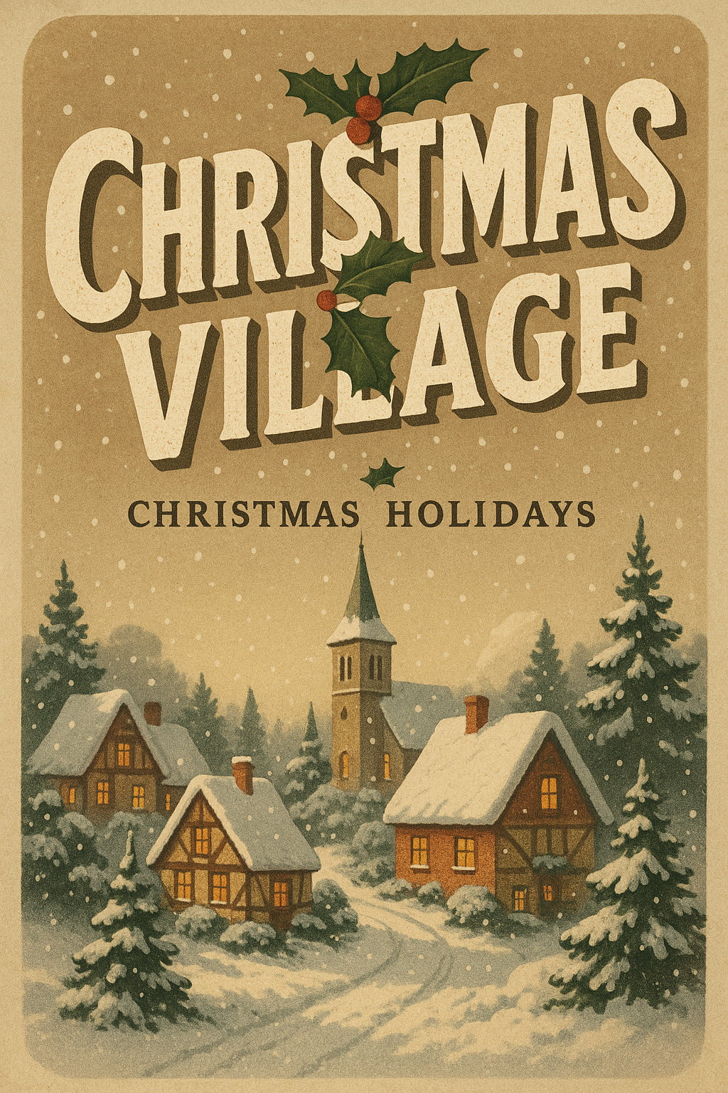 /Collection: /by davooda/Type: PNG/Charming vintage-style illustration depicting a snowy Christmas village, perfect for holiday decorations or greeting cards. The warm colors and festive elements evoke a nostalgic holiday spirit.