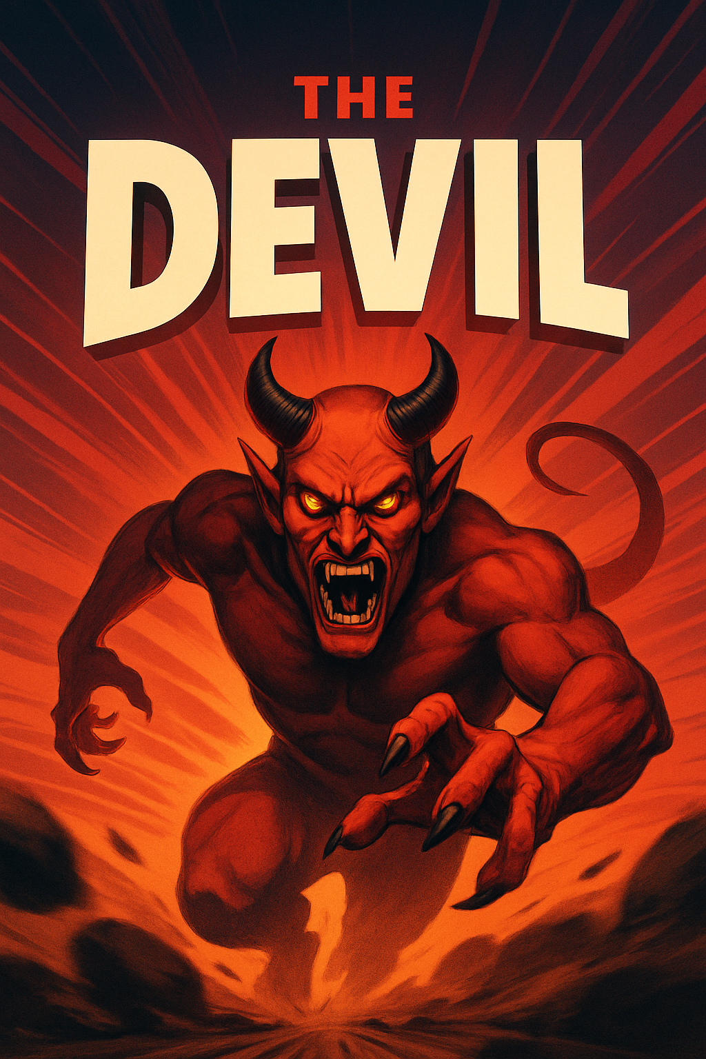 This graphic features a dynamic illustration of The Devil with a bold, fiery background. It uses a comic-style design suitable for posters or book covers.