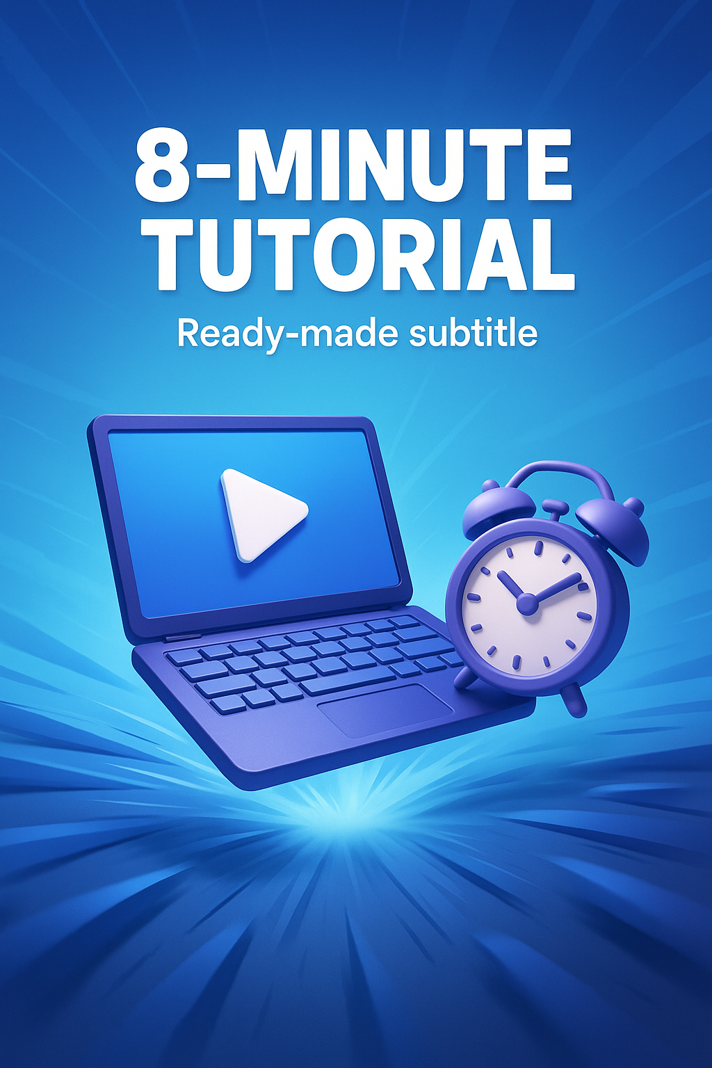 This is a promotional graphic for an 8-minute tutorial, featuring a laptop and clock. It has a modern, vibrant design, ideal for online learning platforms.