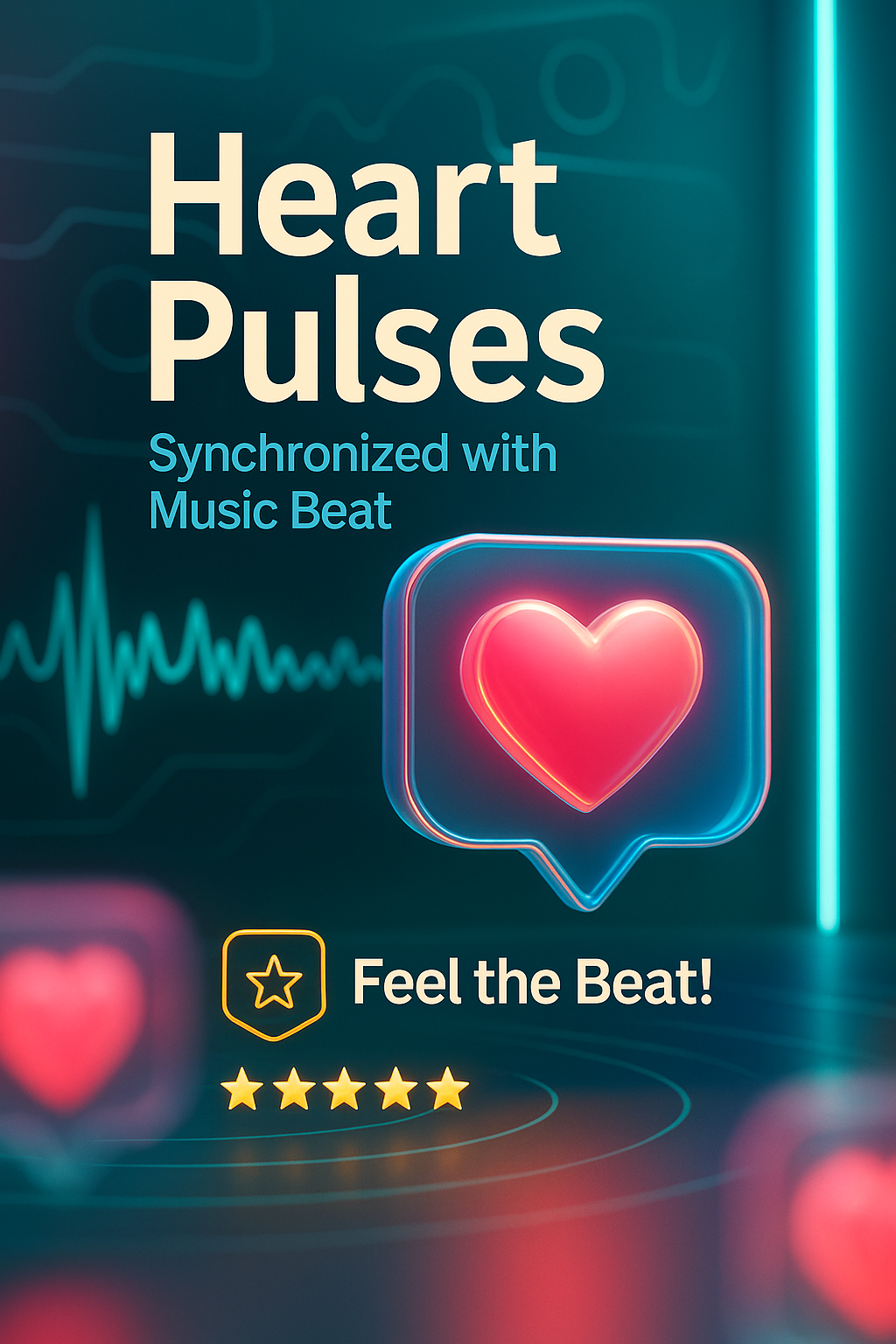 Modern graphic depicting heart pulses synchronized with music, featuring neon elements and a vibrant color palette. Ideal for music apps or health-related promotions.