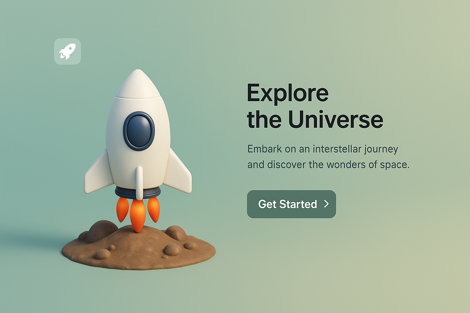 An engaging 3D illustration of a rocket launching from a surface, set against a smooth gradient background. Accompanied by a call-to-action button inviting users to explore the universe.