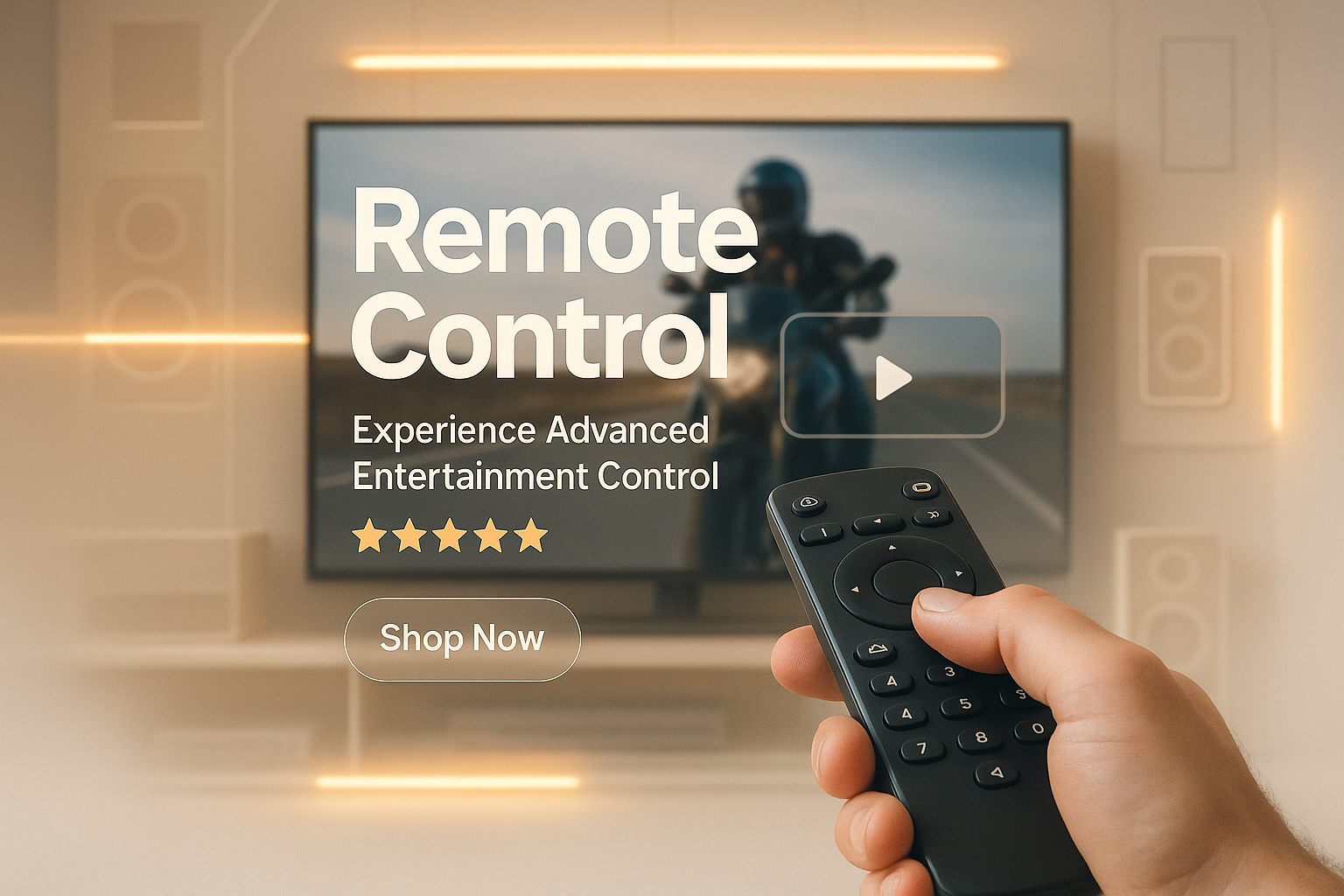 Engaging promotional image showcasing a remote control with a TV in the background, ideal for advertising advanced entertainment systems and home tech products.