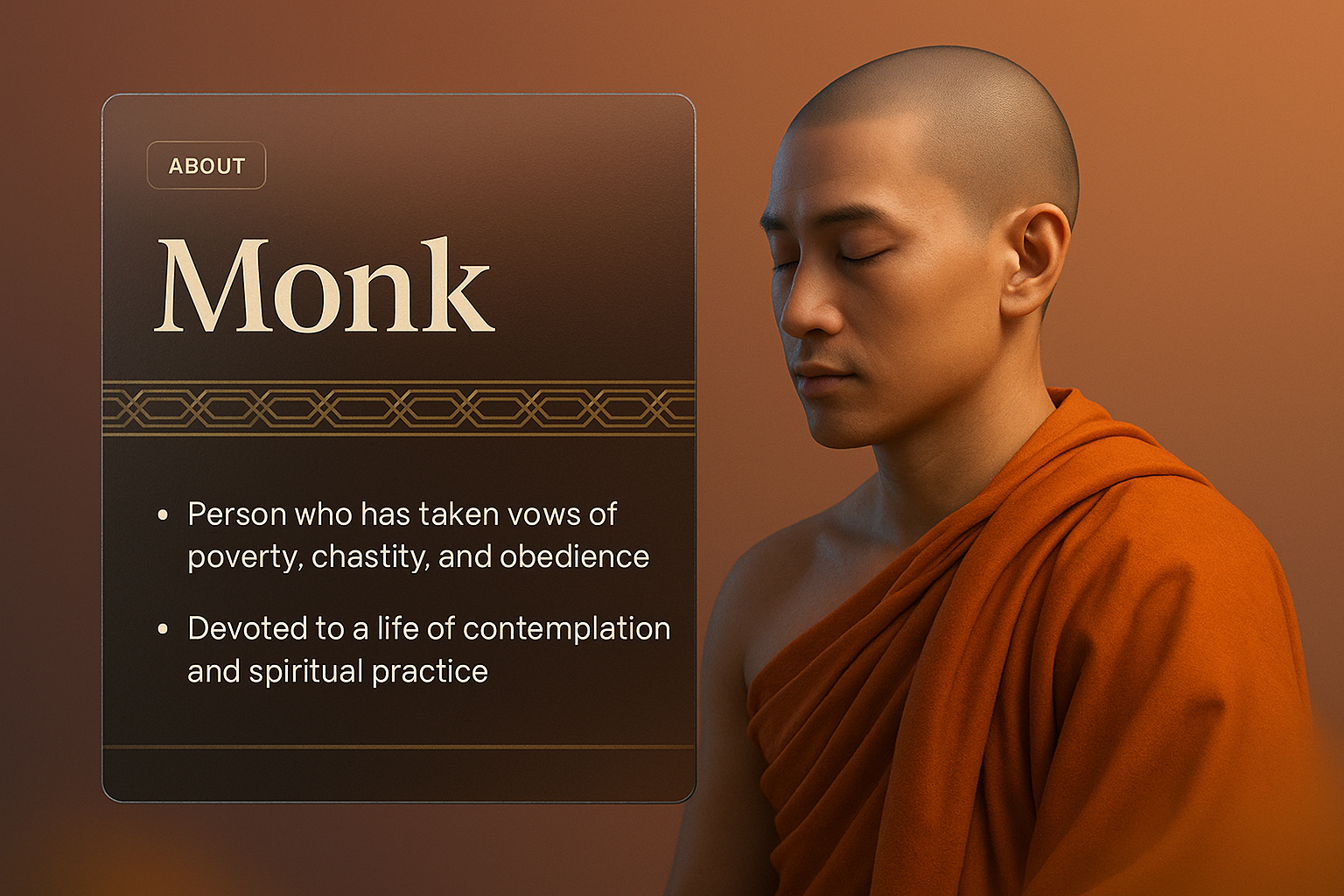 A modern web page design showcasing a monk with a dark overlay and text block. The layout integrates a smooth gradient background and layered visuals for depth.