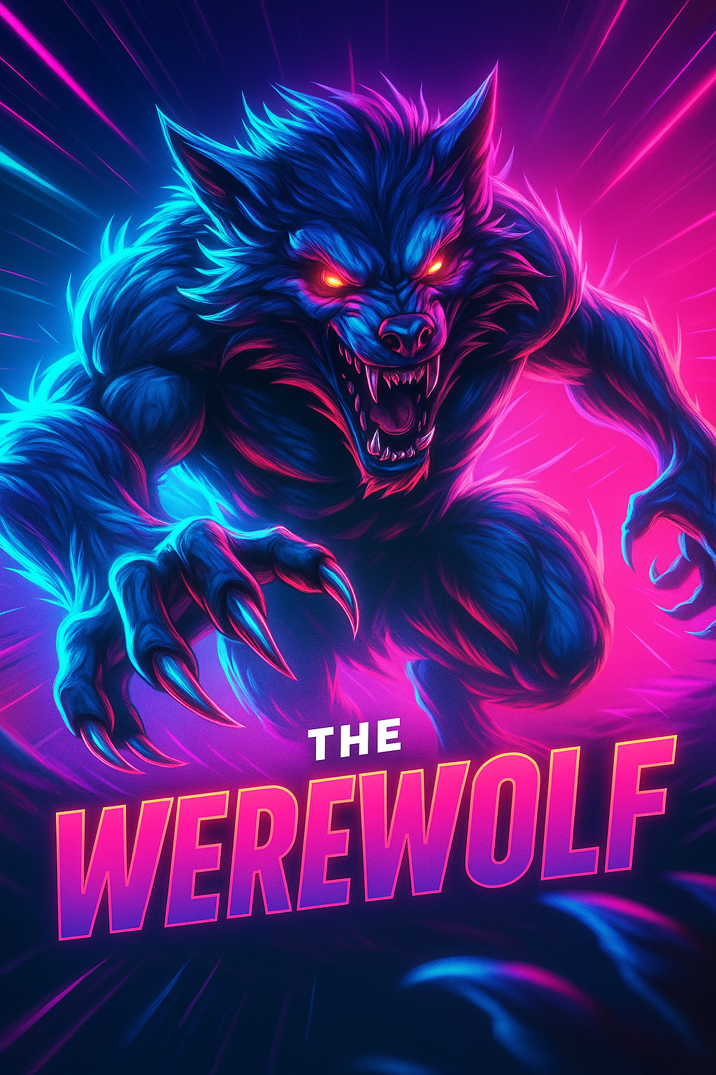 Dynamic Neon Werewolf Illustration with Bold Title Design
