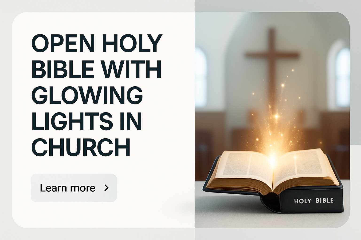 An open Holy Bible emits glowing lights in a church setting, surrounded by a modern layout featuring bold typography and a well-composed geometric background.