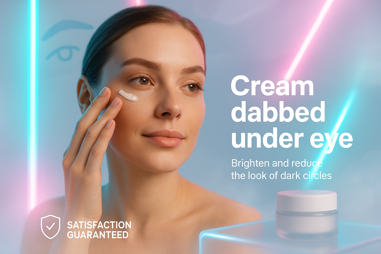 /Collection: /by davooda/Type: PNG/Vibrant skincare promotional image showcasing a woman applying under eye cream, designed for beauty marketing with a modern aesthetic and glowing background elements.