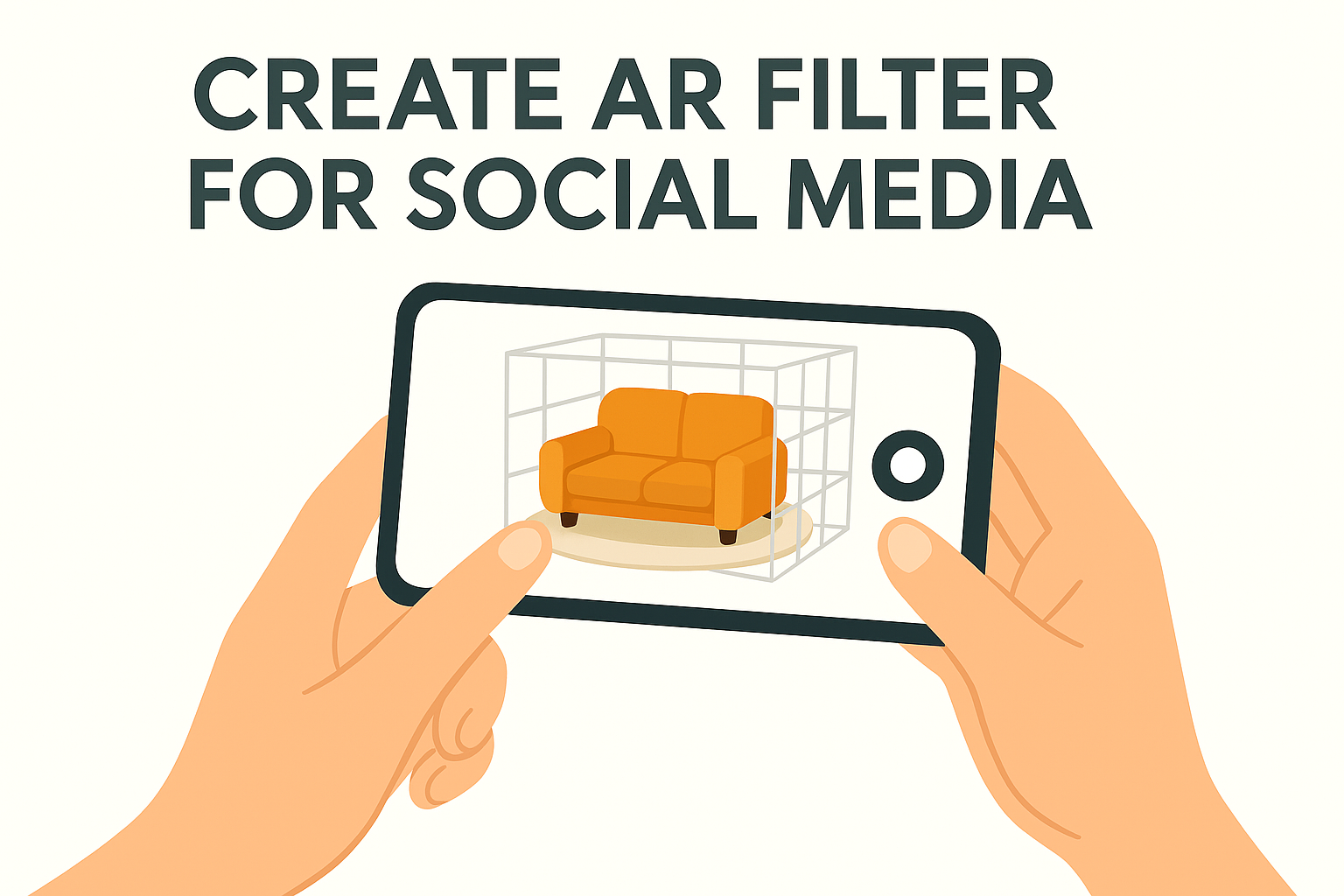 /Collection: /by davooda/Type: PNG/A digital illustration depicting hands holding a smartphone displaying an augmented reality (AR) filter with a 3D couch. Ideal for social media marketing and AR technology discussions.