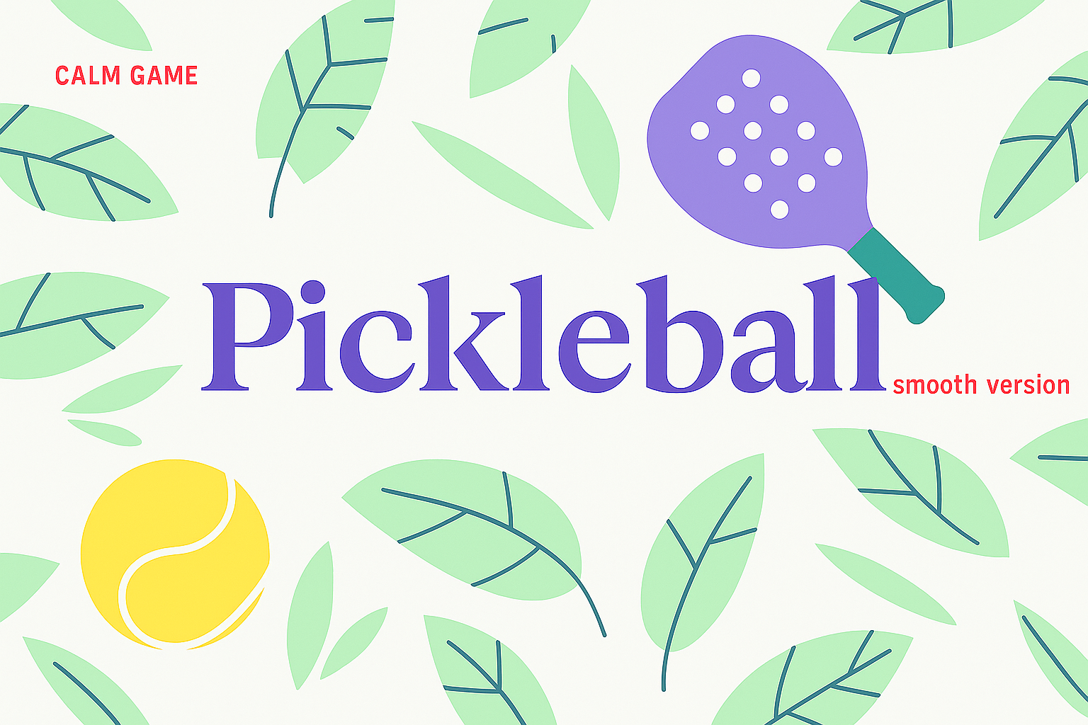 A vibrant design featuring pickleball paddles and leaves, promoting a calm game atmosphere with playful colors and typography.