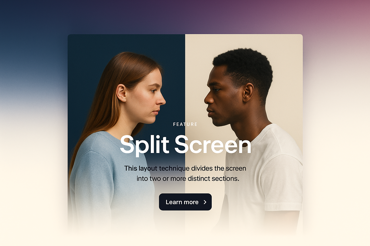 A modern split screen design featuring two individuals facing each other, with a clear title and text block. The gradient background transitions from dark to white, enhancing readability.