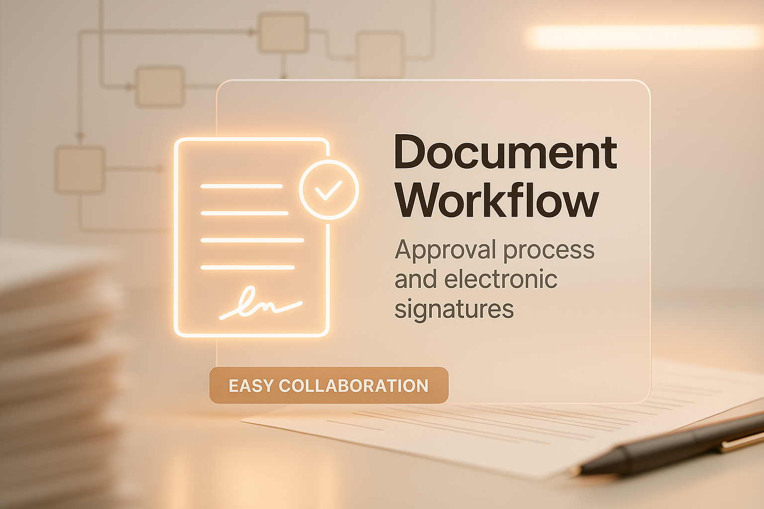 /Collection: /by davooda/Type: PNG/Stylish infographic illustrating a document workflow process with an emphasis on easy collaboration and approval. Ideal for business presentations and digital marketing.