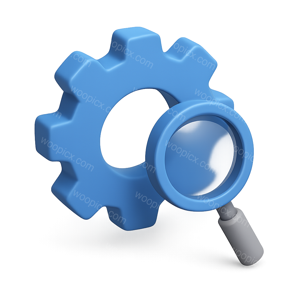 A stylized 3D icon featuring a blue gear paired with a magnifying glass, designed in an isometric view with a transparent background, creating a modern and volumetric appearance.