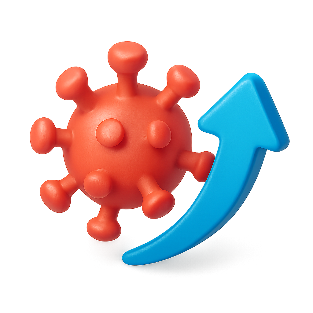 This image features a 3D isometric icon depicting a red virus symbol alongside a blue upward arrow, portraying a sense of growth or increase, set against a blurred background.
