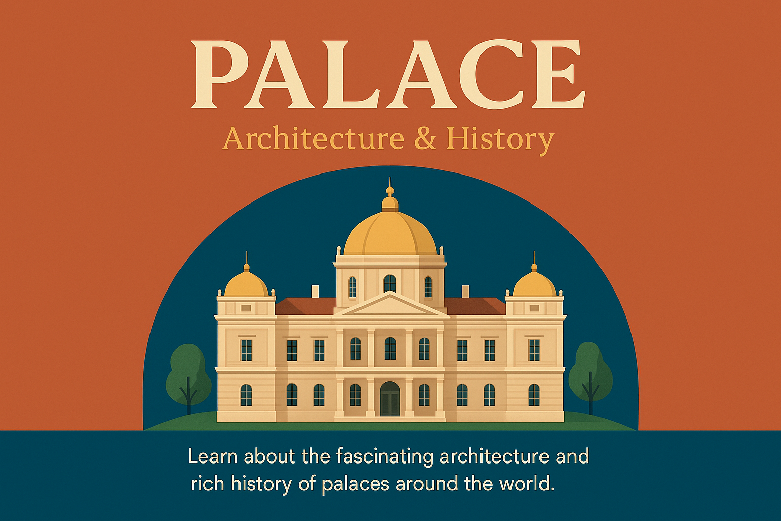 An illustrated geometric palace with a vibrant three-color scheme, showcasing its architecture and historical significance, framed by a contrasting background.