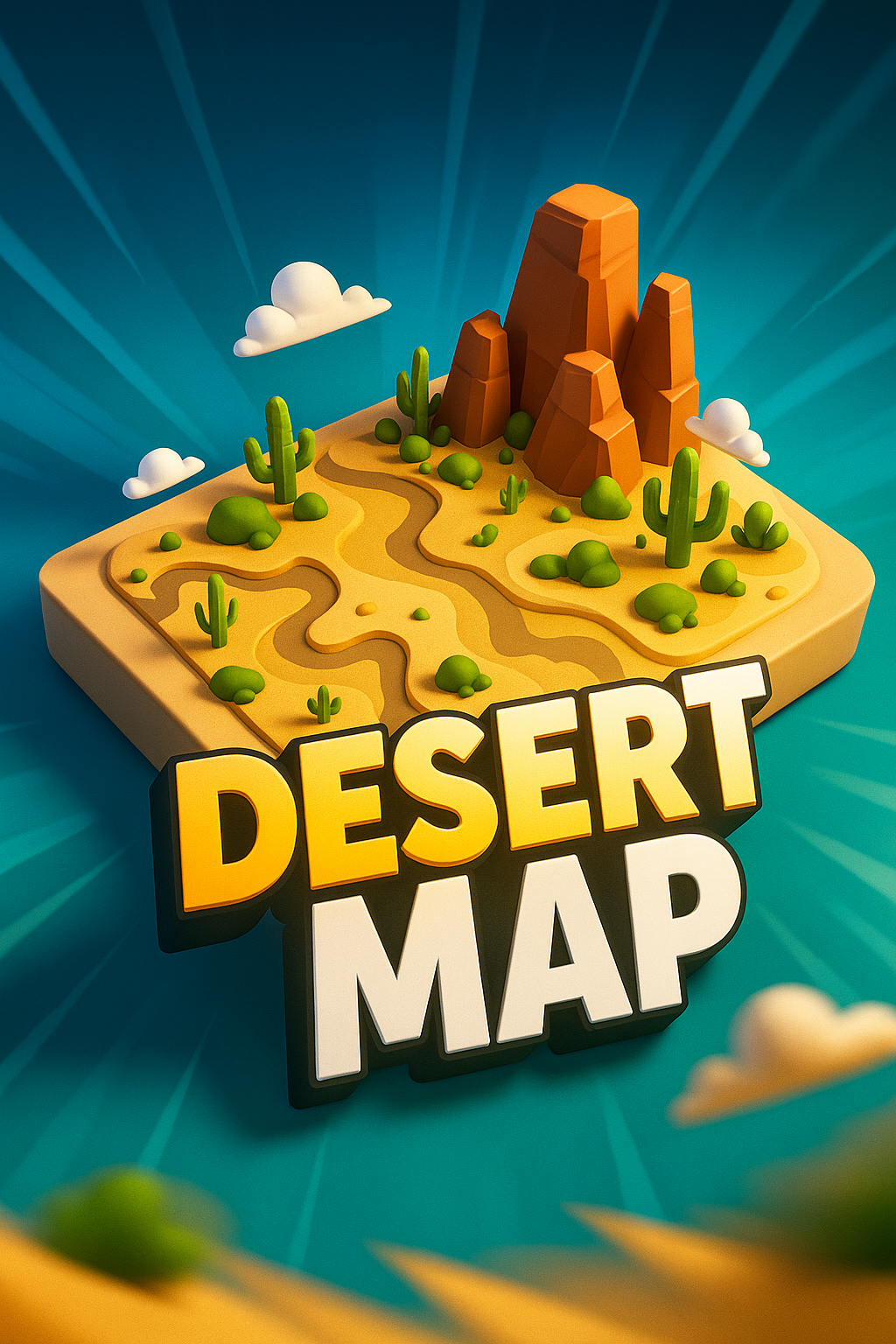 /Collection: /by davooda/Type: PNG/A colorful 3D illustration of a desert map featuring winding paths, cacti, and rocky formations, set against a vibrant gradient background. Dynamic lines radiate from the center.
