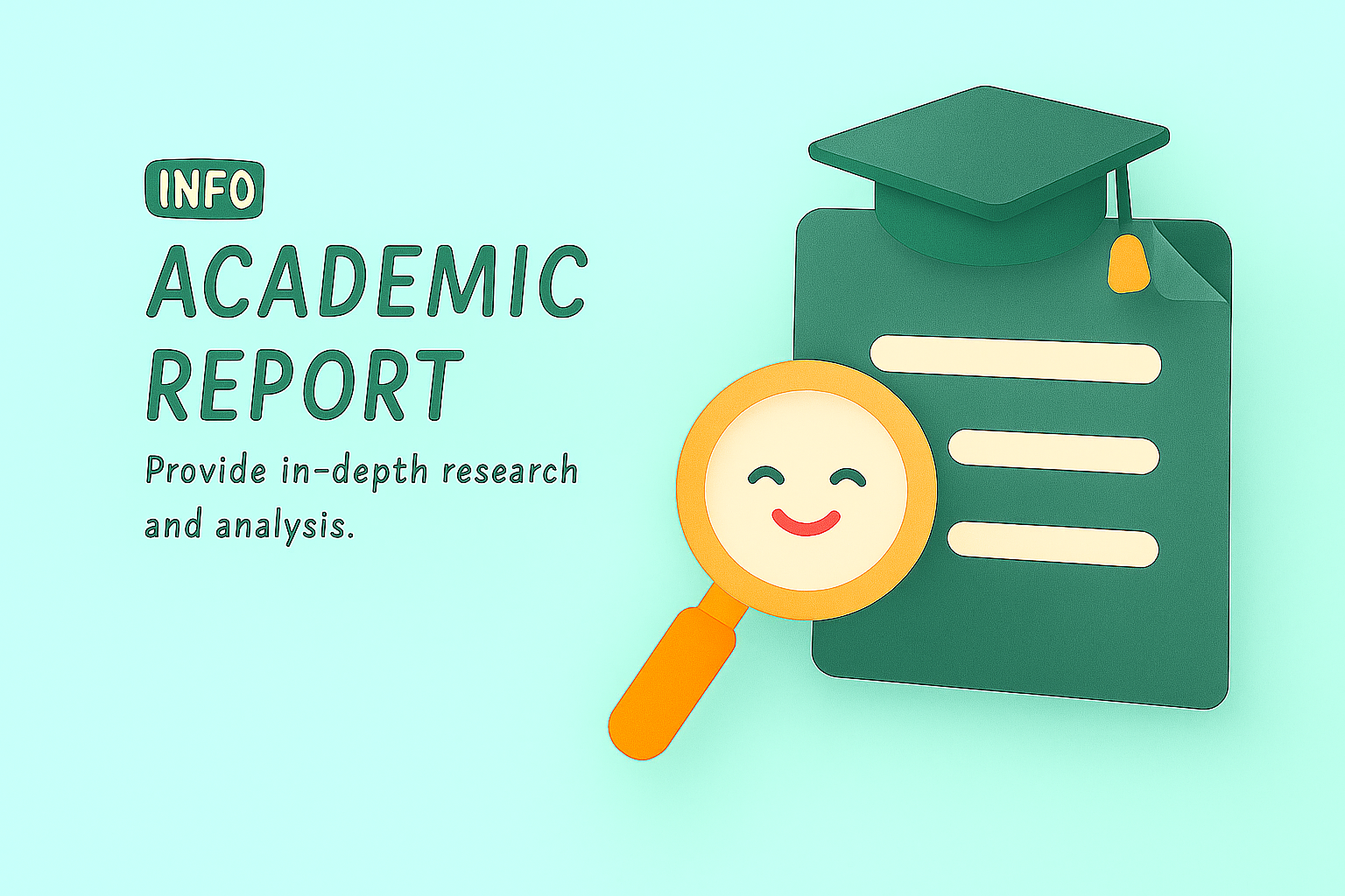 A visually engaging graphic representing an academic report, featuring a graduation cap and a magnifying glass, ideal for educational content and research presentations.