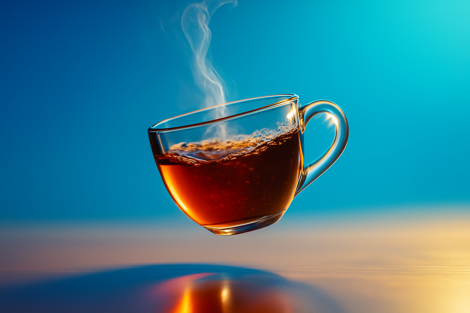 /Collection: /by davooda/Type: PNG/A visually engaging image of a glass tea cup floating in mid-air, steam rising from the warm beverage. The background features a smooth gradient of vibrant colors, enhancing the realism and dynamic appeal.