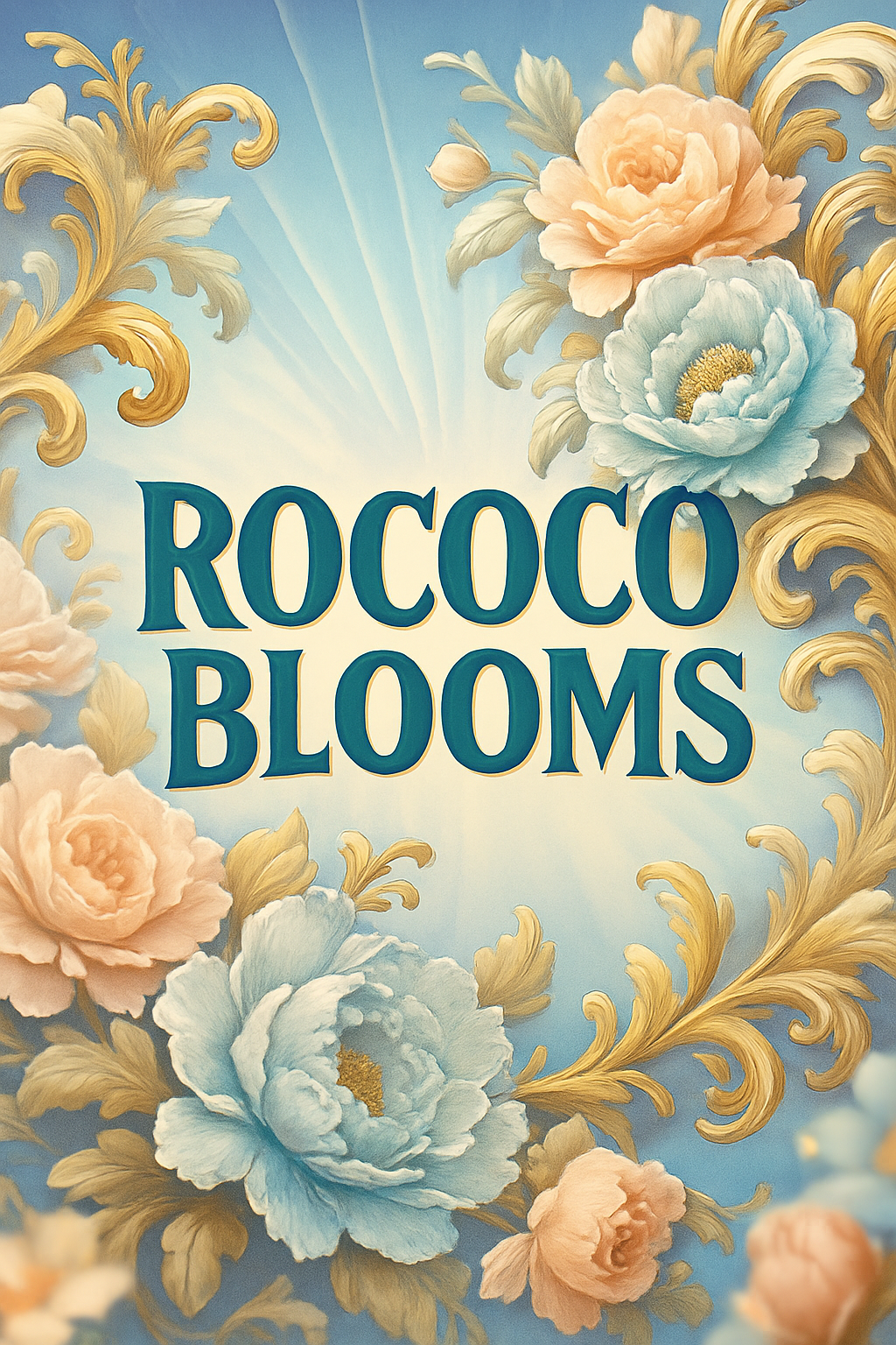 A stunning rococo wallpaper featuring intricate floral designs in pastel tones of blue and gold, creating a dreamy, fairytale aesthetic. The composition highlights dynamic elements and a layered visual structure.