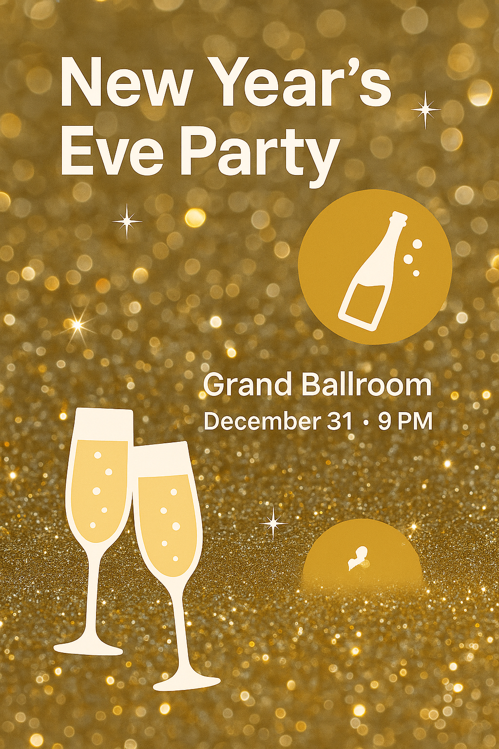 Festive party invitation graphic featuring champagne glasses and sparkling background, ideal for promoting New Year's celebrations and events.