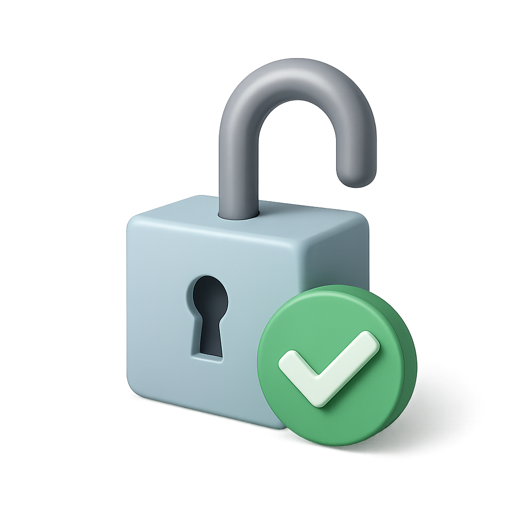 A stylized 3D icon featuring an open padlock alongside a green check mark, presented in a three-quarter isometric view with a smooth, volumetric design.