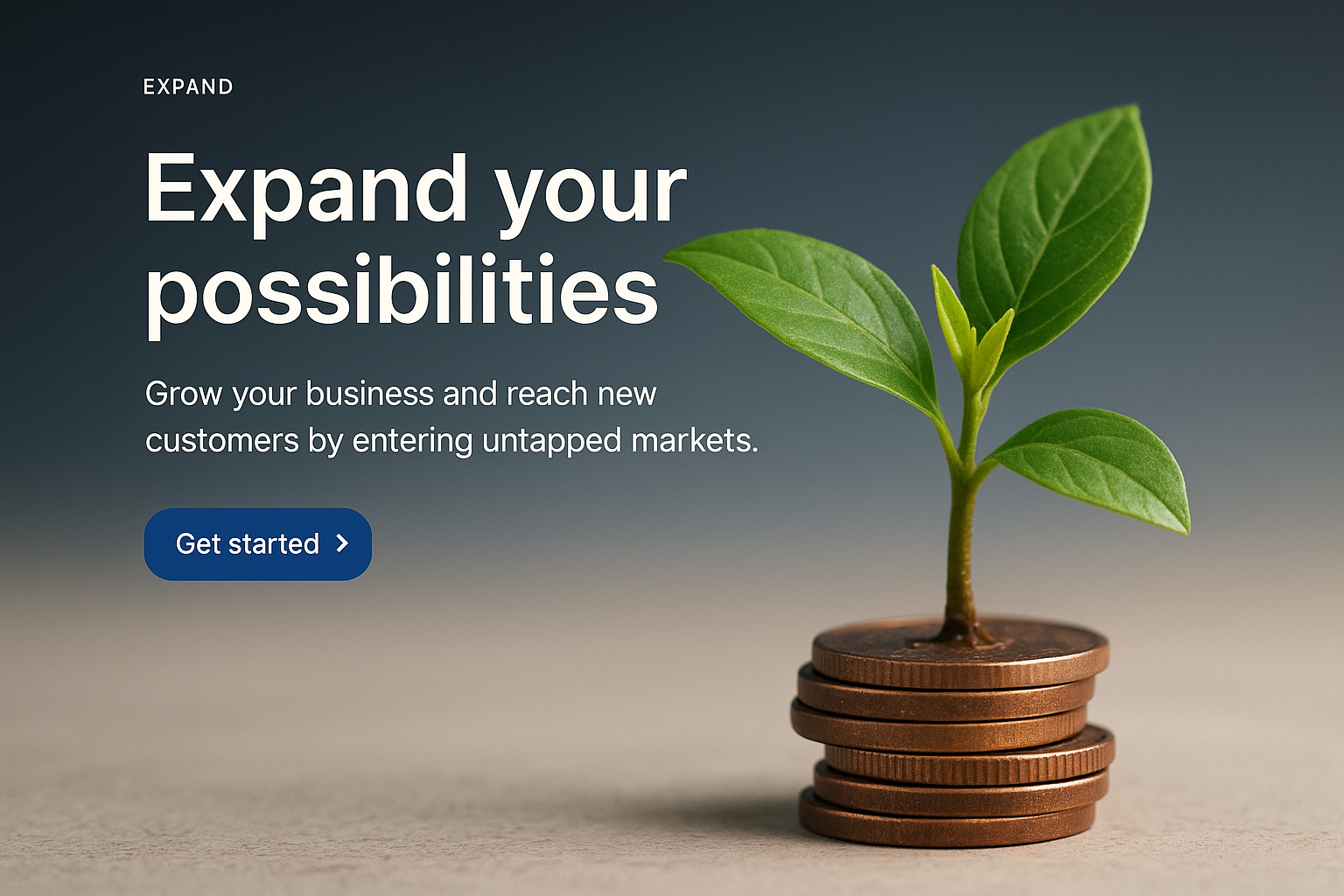 A modern web page layout featuring a plant growing from stacked coins, symbolizing business expansion. Includes a clear call-to-action button and engaging text.