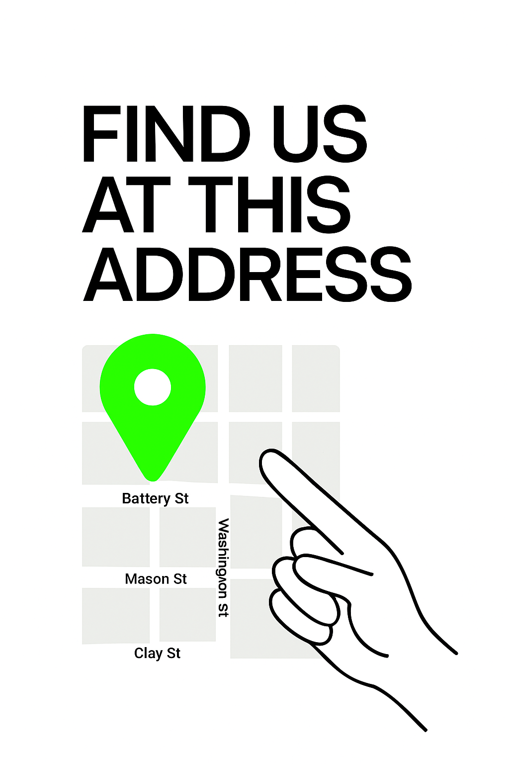 Informative graphic featuring a simplified map with a highlighted location marker and directional hand illustration, ideal for guiding visitors to a specific address.