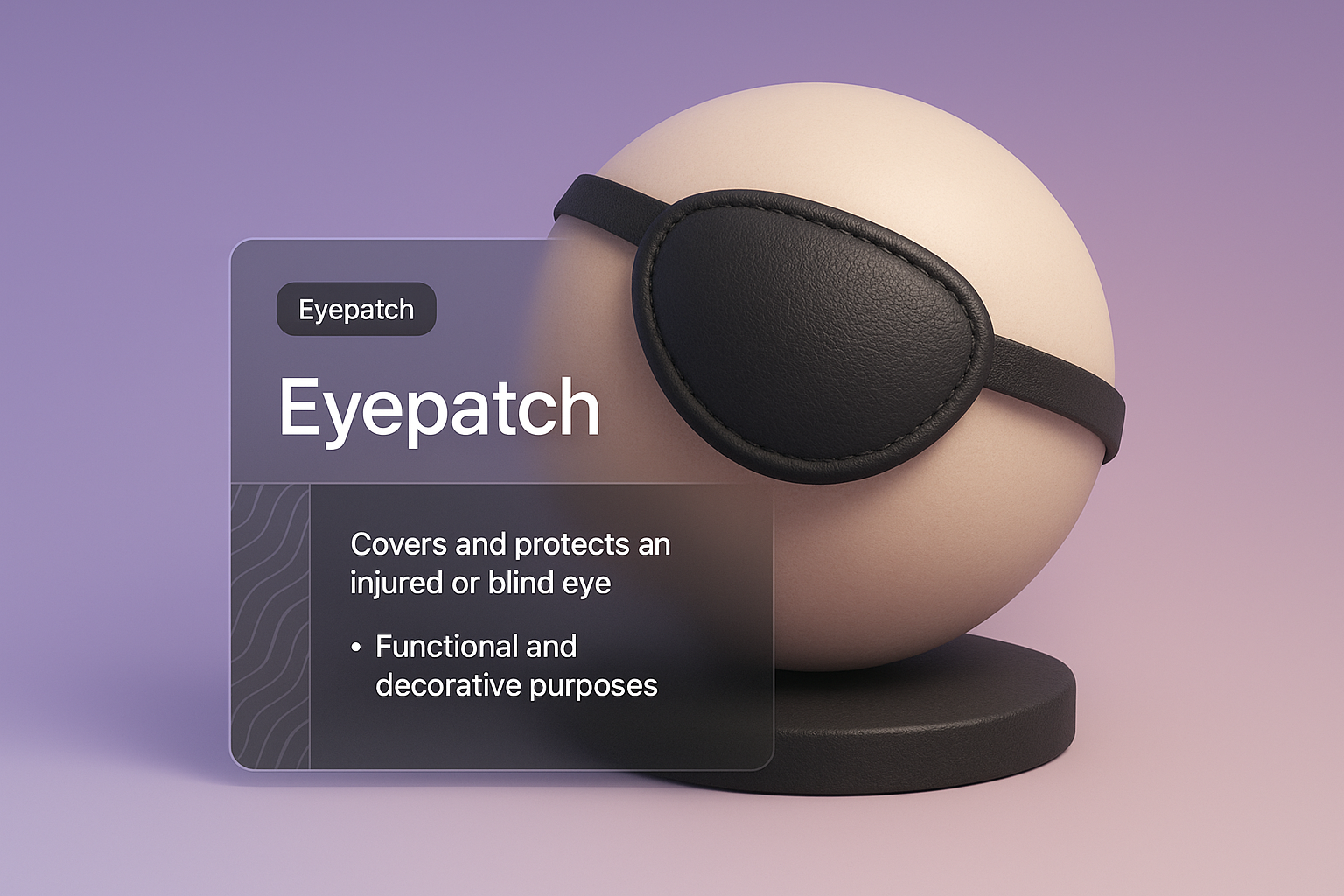 A 3D illustration of an eyepatch on a spherical base, featuring a gradient background and integrated text blocks with clear, modern design elements.