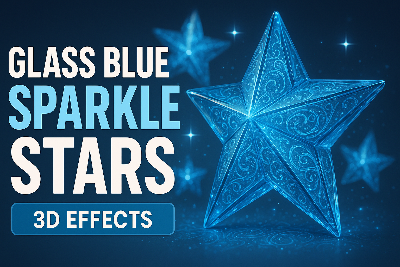A visually captivating graphic featuring 3D glass-like blue stars adorned with intricate designs, suitable for decorative or thematic purposes in digital media.