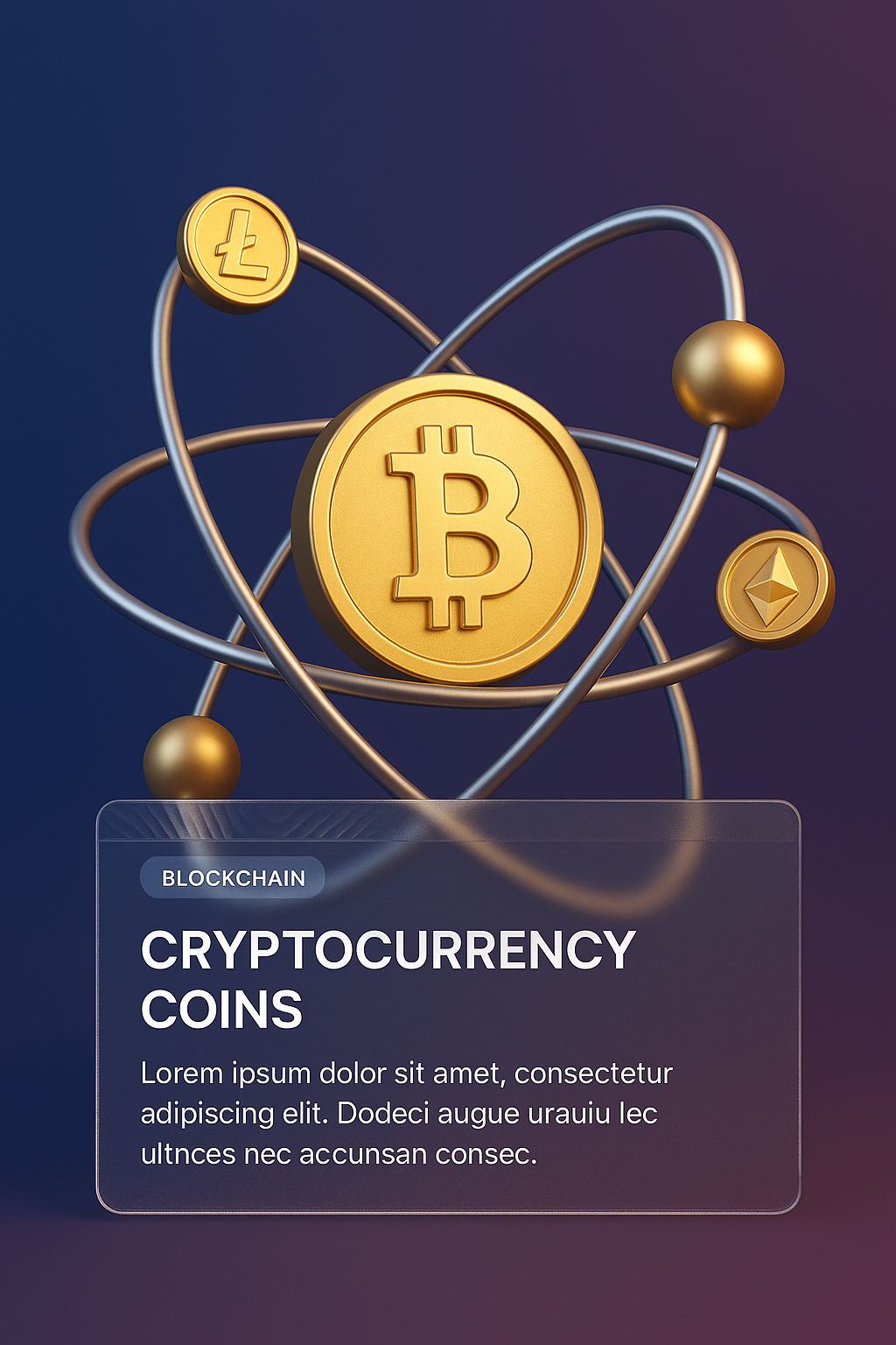/Collection: /by davooda/Type: PNG/A stunning 3D depiction of cryptocurrency coins resembling atomic molecules, featuring a gradient background and a stylish information block with a modern design.
