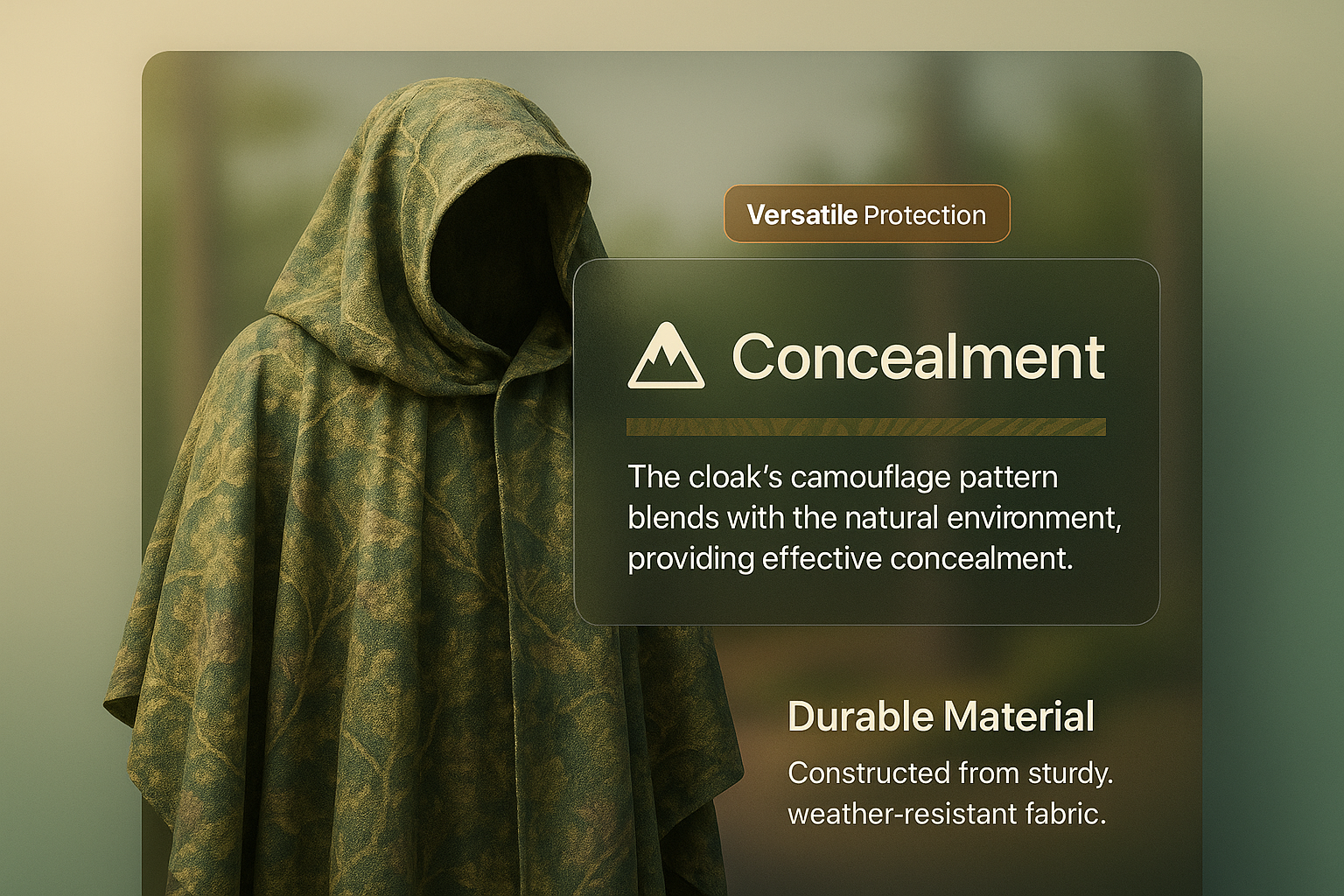 A 3D illustration of a camouflage cloak designed for versatility and concealment, integrated with text elements and a gradient background.