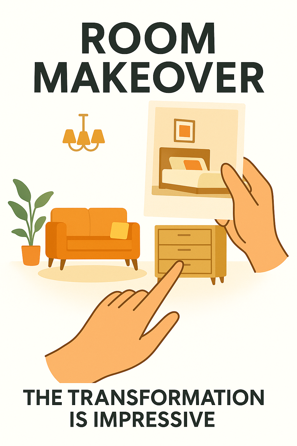A vibrant illustration depicting a room makeover theme, featuring a hand holding a photo of a transformed room. Ideal for home decor promotions or renovation blogs.