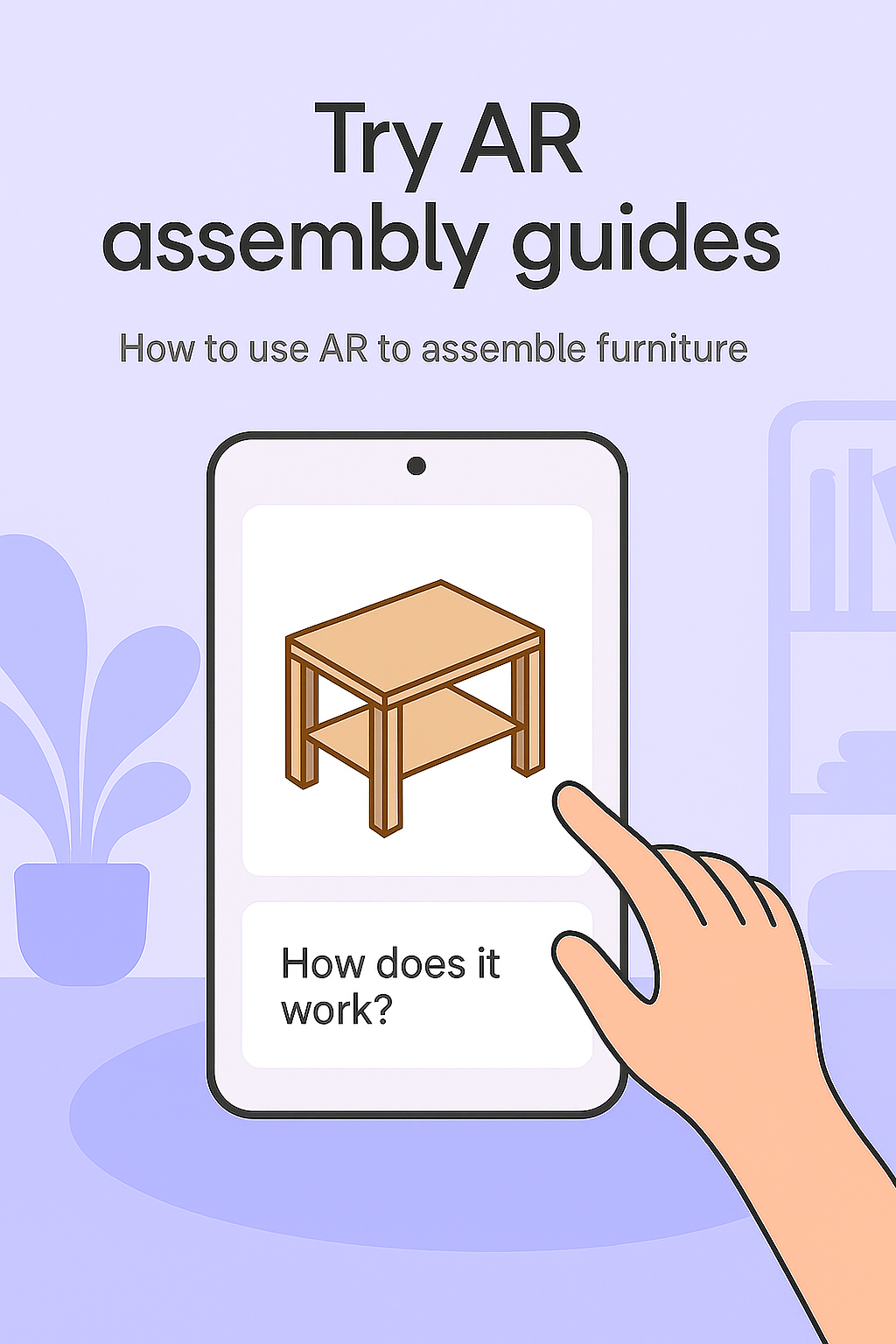 Illustrative graphic showcasing an AR application for furniture assembly, featuring a hand interacting with a digital table, set against a soft, modern background. Ideal for tech or furniture marketing.