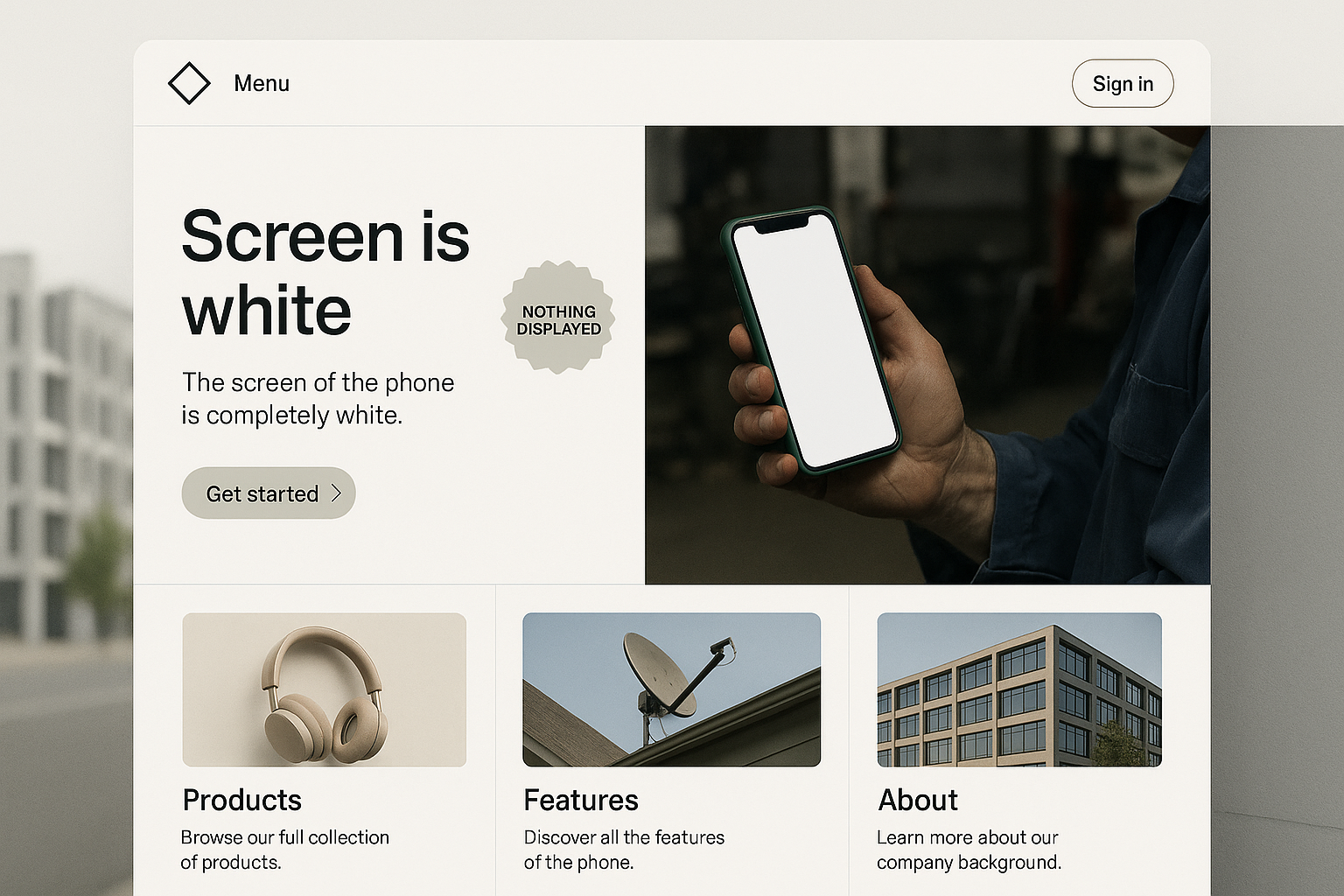 A modern landing page design showcasing a white screen on a phone held by a mechanic, featuring a clean layout with sections for products, features, and about.