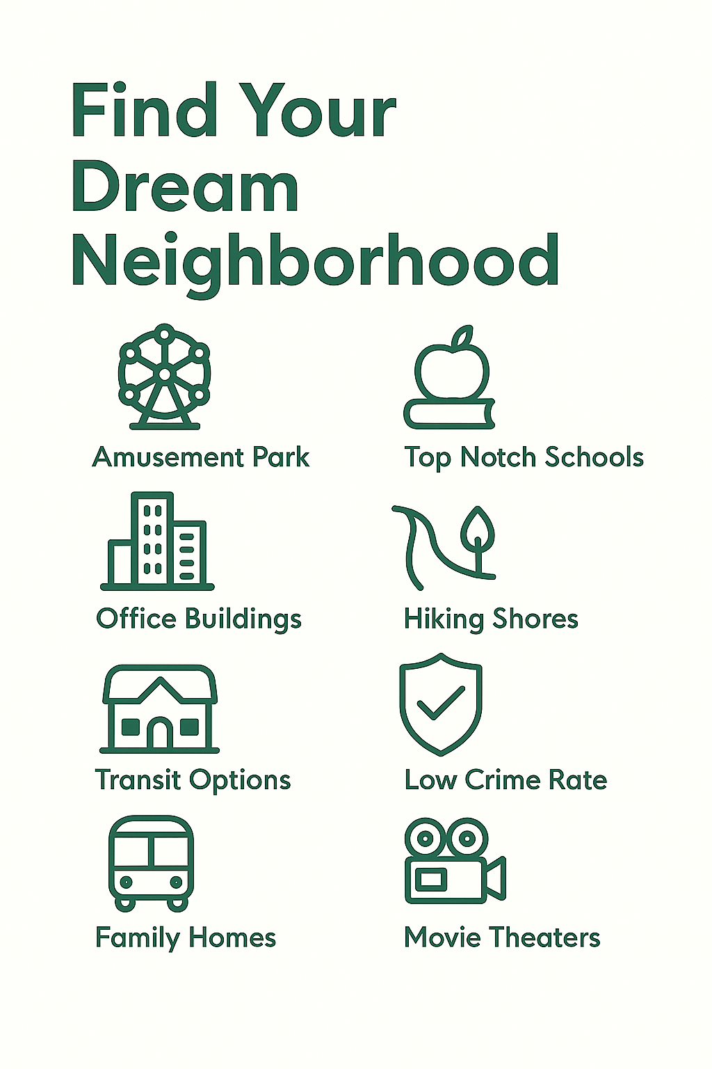 Informative infographic showcasing essential neighborhood features such as schools, parks, and safety, designed for potential homebuyers or renters.