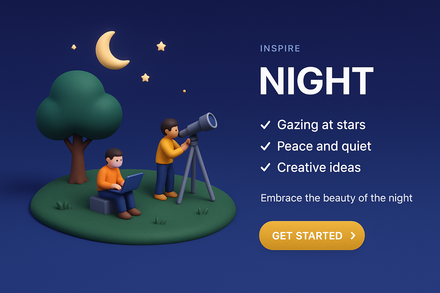 A detailed 3D illustration depicting a cozy nighttime setting where two small figures engage in stargazing. The scene features vibrant colors and a smooth gradient background.